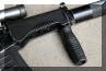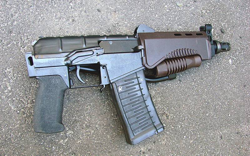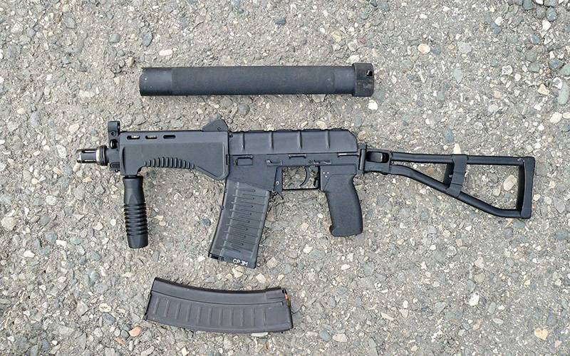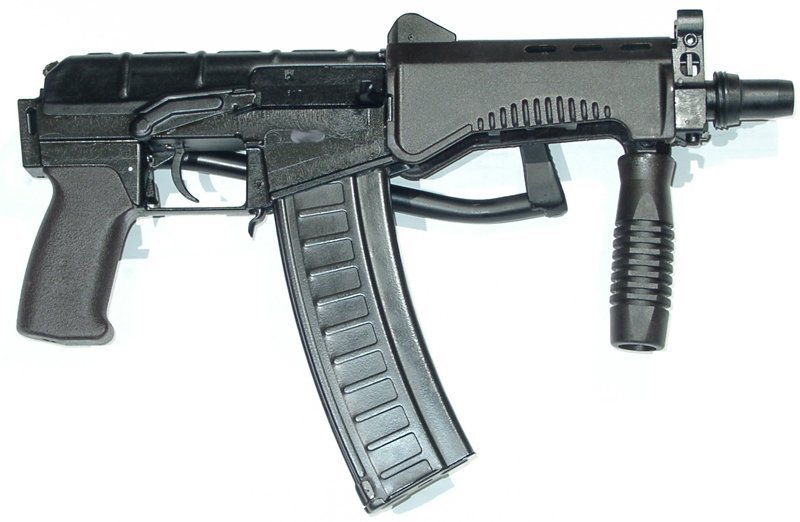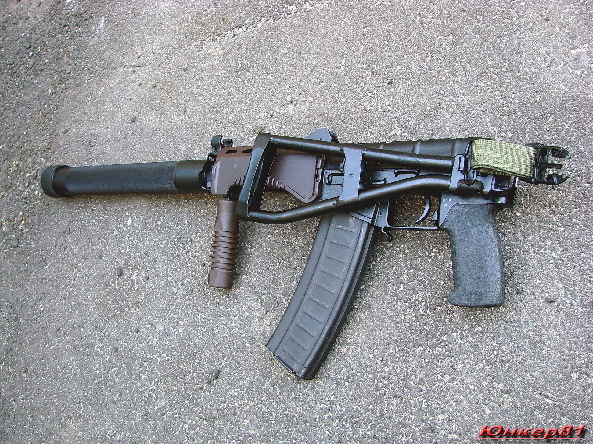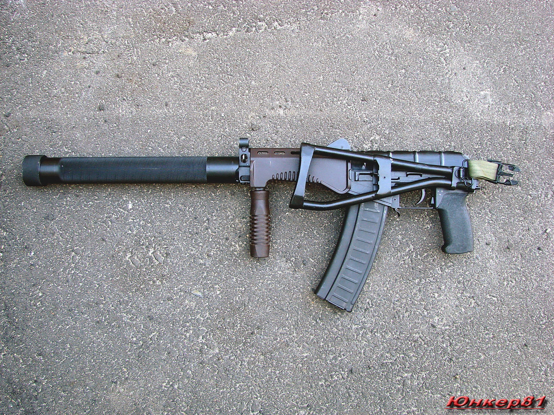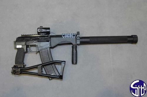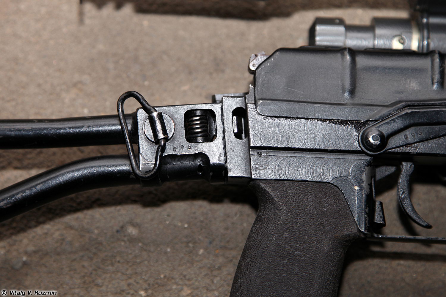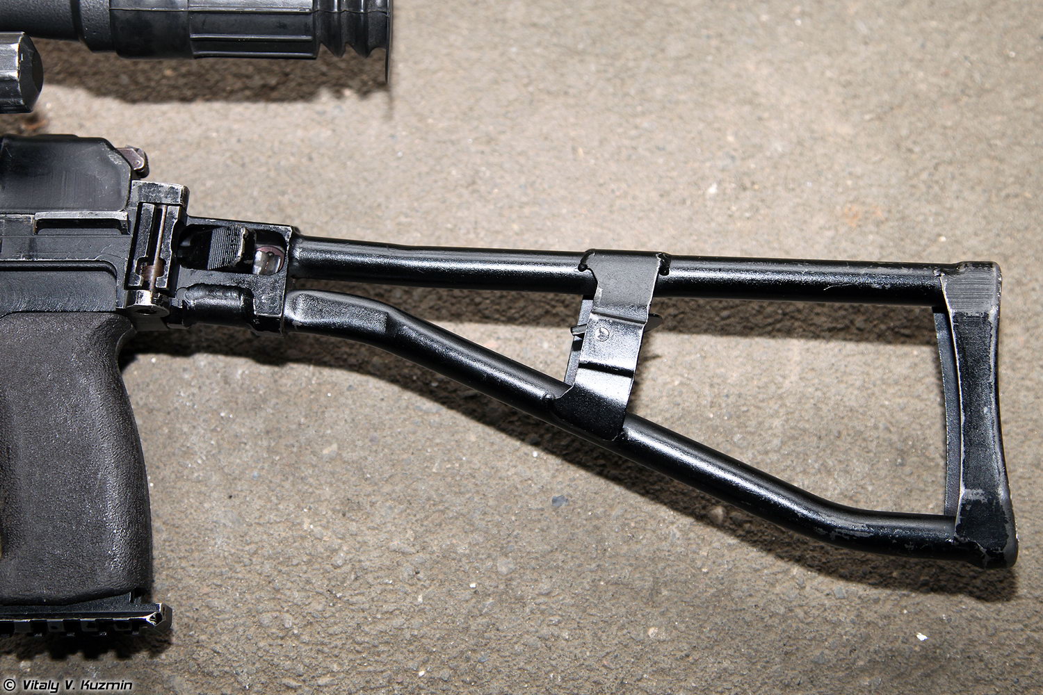 SR-3M安装了AS步枪的侧折叠枪托,由钢管和塑料托底板组成,不使用时折叠在枪的左侧。在护木下方还有一个可折叠的前握把。