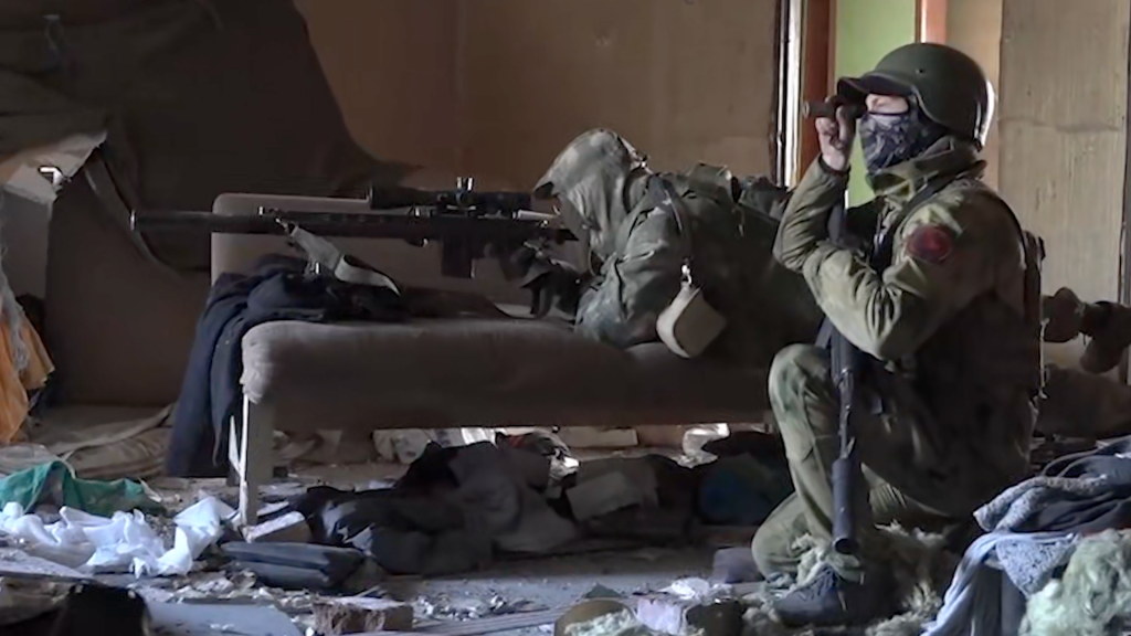 最早曝光的MTs-566,俄罗斯联邦通讯社报道瓦格纳在巴赫穆特的狙击小组的画面