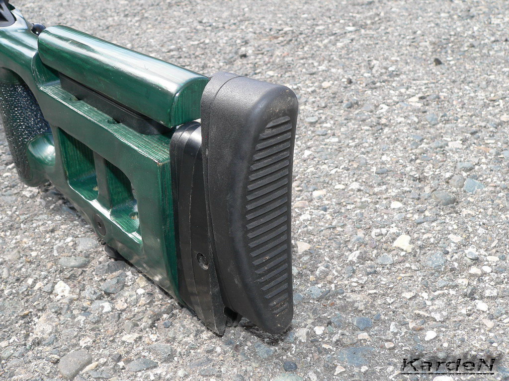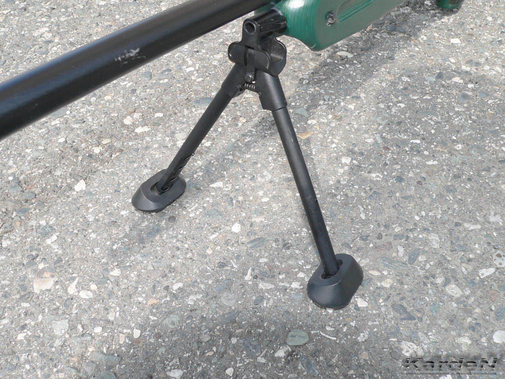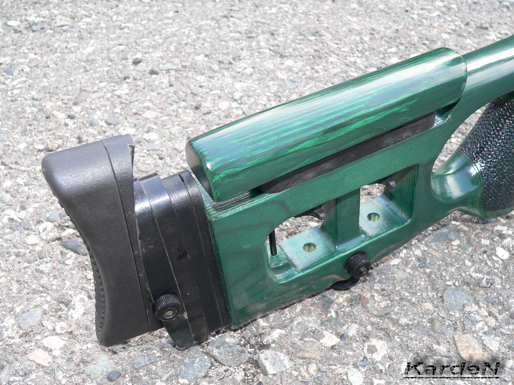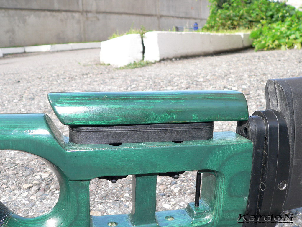与前托为一体的枪托由胶合板制成,通常厂家会涂成绿色。肩托上有长度可调的托底板和高度可调的贴腮板。枪托前端安装有可折叠的两脚架,腿架的长度有四档可调,还配备有特制的橡胶“套垫”,以便在松软土质条件下使用。枪托尾部有可收缩进枪托内的尾撑。有一个可拆卸的提把,通过蝶形螺母固定在前托的左侧或右侧,提把的作用是对于喜欢提枪跑步的射手,避免他们抓到光学瞄准镜上。