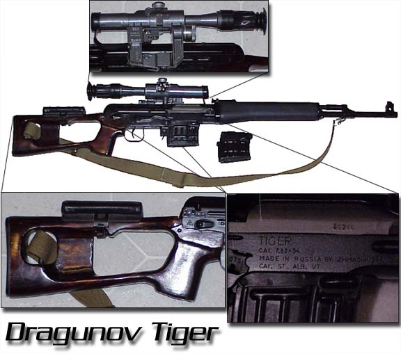 这一种名为“老虎”的步枪是伊孜玛什公司在SVD基础上开发的民用猎枪,枪管比军用型的短,枪身上的英文表明此枪是专供出口的,事实上在上下图中的枪都是美国的SVD爱好者的藏品。Tiger全长1090mm,另外还有加长型的Tiger-1,全长1150mm。在美国销售时标配5发容量的弹匣。