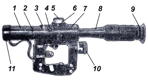 SVD标配的瞄准镜是4×24mm的PSO-1(Pritsel Snaipersky,Optichesky)型瞄准镜,瞄准镜全长375mm,视场6°。虽然PSO-1瞄准镜的放大倍率只有4倍,但射程调节螺帽可以将弹道修正到1000m(误差±1m),加上瞄准镜的分划板上还有三个距离分划,每个分划100m,所以SVD的最大射程可达1300m。瞄准镜上有光源和电池,夜间可以照亮分划板,另外还有一种可以旋转安装上瞄准镜的红外滤光器,用于在夜间射击时过滤外部红外光源,但瞄准镜本身没有夜视能力。由于SVD的机匣就是AK式的,因此瞄准镜的安装座只能装在机匣左侧。