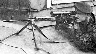 由于SVD原本的设计中没有考虑使用两脚架的问题,在阿富汗战争时期,许多苏军狙击手自己动手改装,把RPK-74的两脚架安到SVD上的。上图左中就是一例,但这种方式有个缺点把两脚架的支点安装在枪管上会破坏射击精度。后来俄罗斯吸取了这些狙击手的经验,为生产了一种专用的SVD伸缩式两脚架,并在机匣底部、弹匣前方钻一个小孔,把脚架的支撑点移到机匣前方的位置上,这样就能够保证枪管不受脚架影响了。