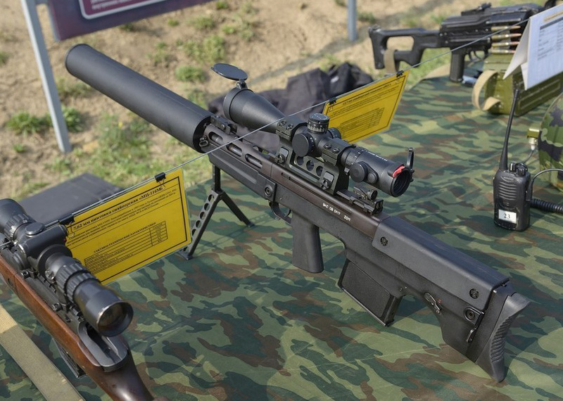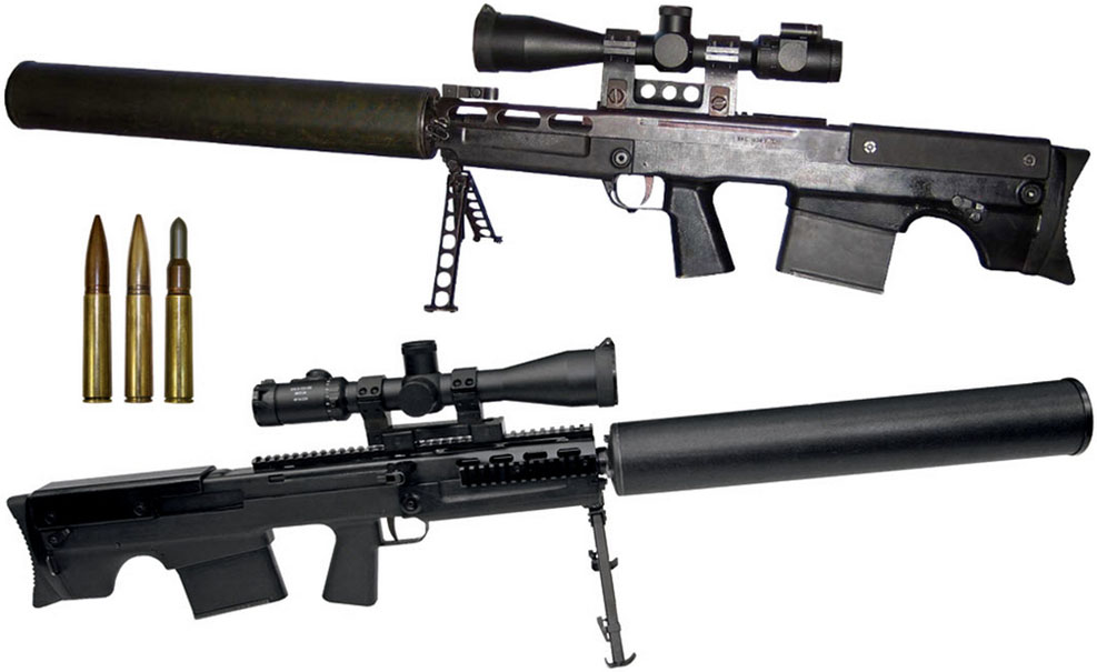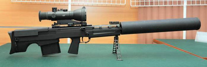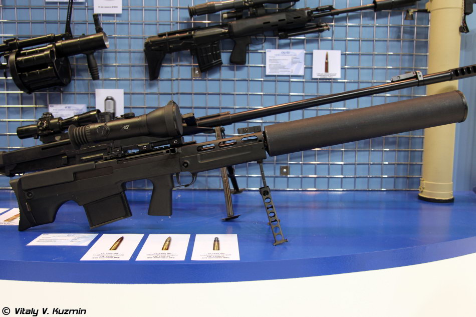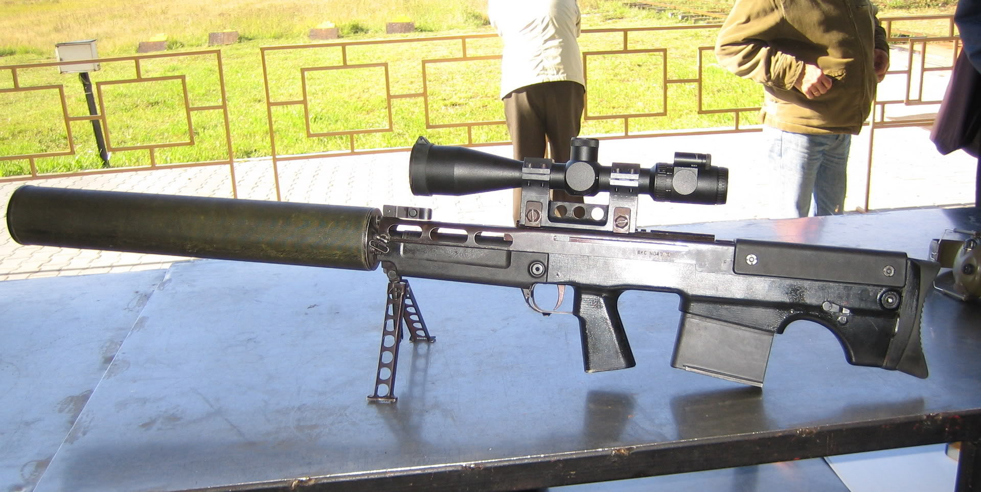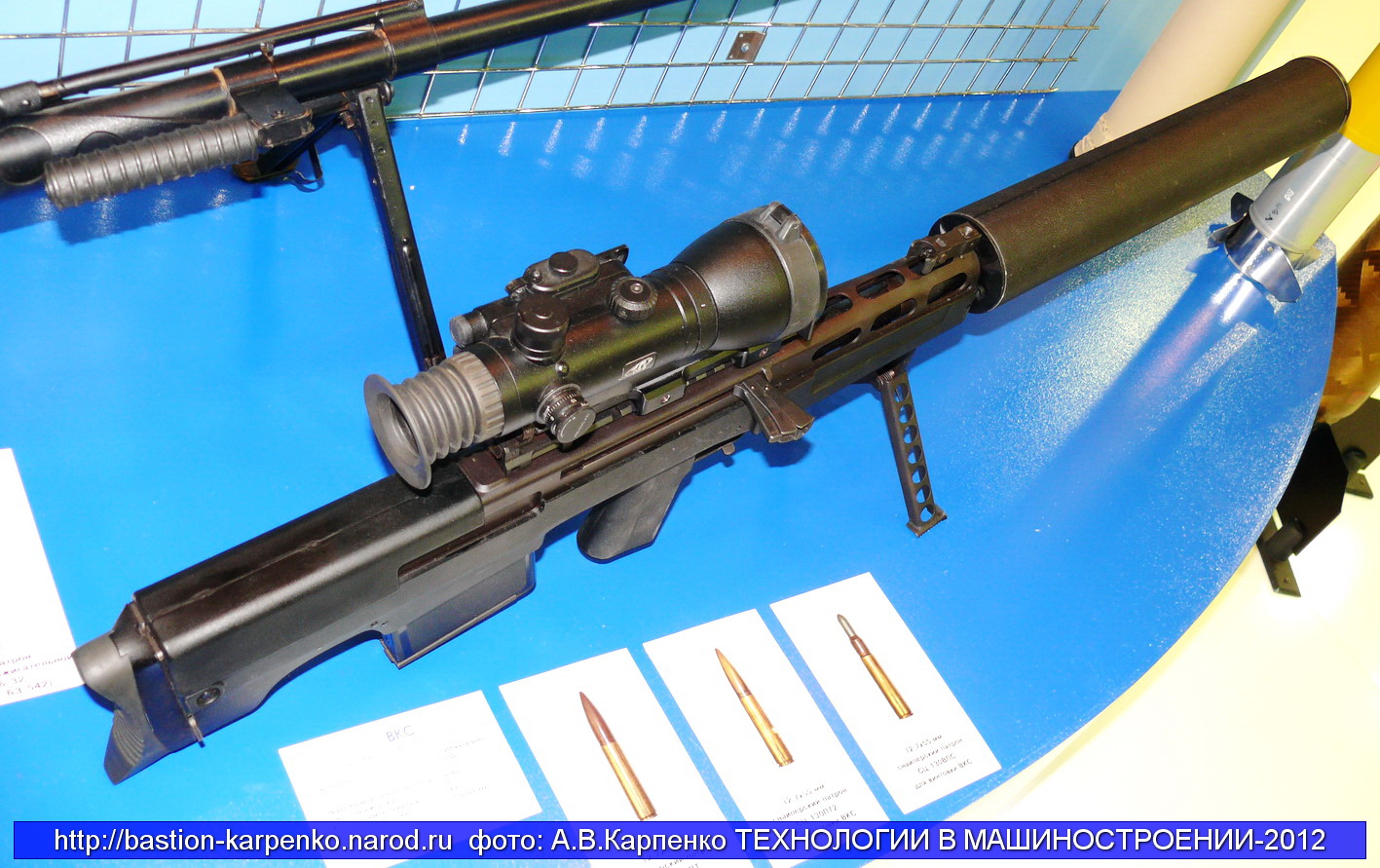 12.7mm VSSK“Vychlop”微声狙击步枪是由俄罗斯仪器设计局(KBP)研制的特种武器,VSSK是“大口径特种狙击步枪”(Vintovka Snayperskaya Spetsialnaya Krupnokalibernaya)的缩写,而“Vychlop”则是俄文“排气”的对应英文拼写,对应的俄文则为ВССК“Выхлоп”。该枪首次公开是在2005年莫斯科的国际警用装备展上展出。后来VSSK正式定型为VKS,是“大口径狙击步枪”(Vintovka Krupnokalibernaya Snayperskaya)的缩写,炮兵总局的定型型号是6C8。