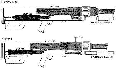 由于枪管和枪机组成的后坐体在包括枪托组件的下机匣内滑动,因此射手可以握持机匣底下的握把使枪托抵肩,而使用一个小握把来扣压或解脱扳机。射手可采用常规姿势进行射击,左手或右手的射手都能方便使用。
