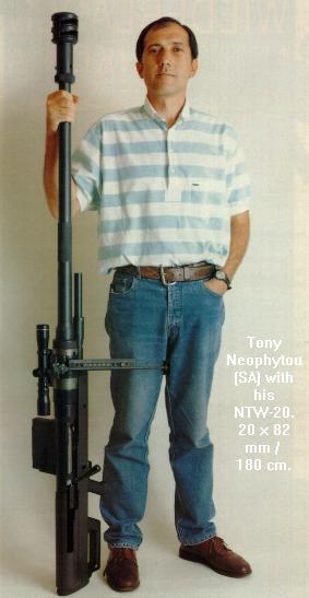 NTW-20是一种远距离反器材步枪,适合南非空旷广阔的平原使用。它有两个型号,20mm口径型和14.5mm口径型,后者也被称为NTW-14.5,但事实上不需要完全分解或改装武器就能在这两种型号之间进行转换,只需要更换枪机、枪管、瞄准装置和弹匣,操作简单,不需要专门的工具,例如枪管的固定螺母只要用两个弹壳底缘分别插入螺母沟槽里就能拧紧或拧松螺母,在野战条件下大约1分钟内就能转换口径。