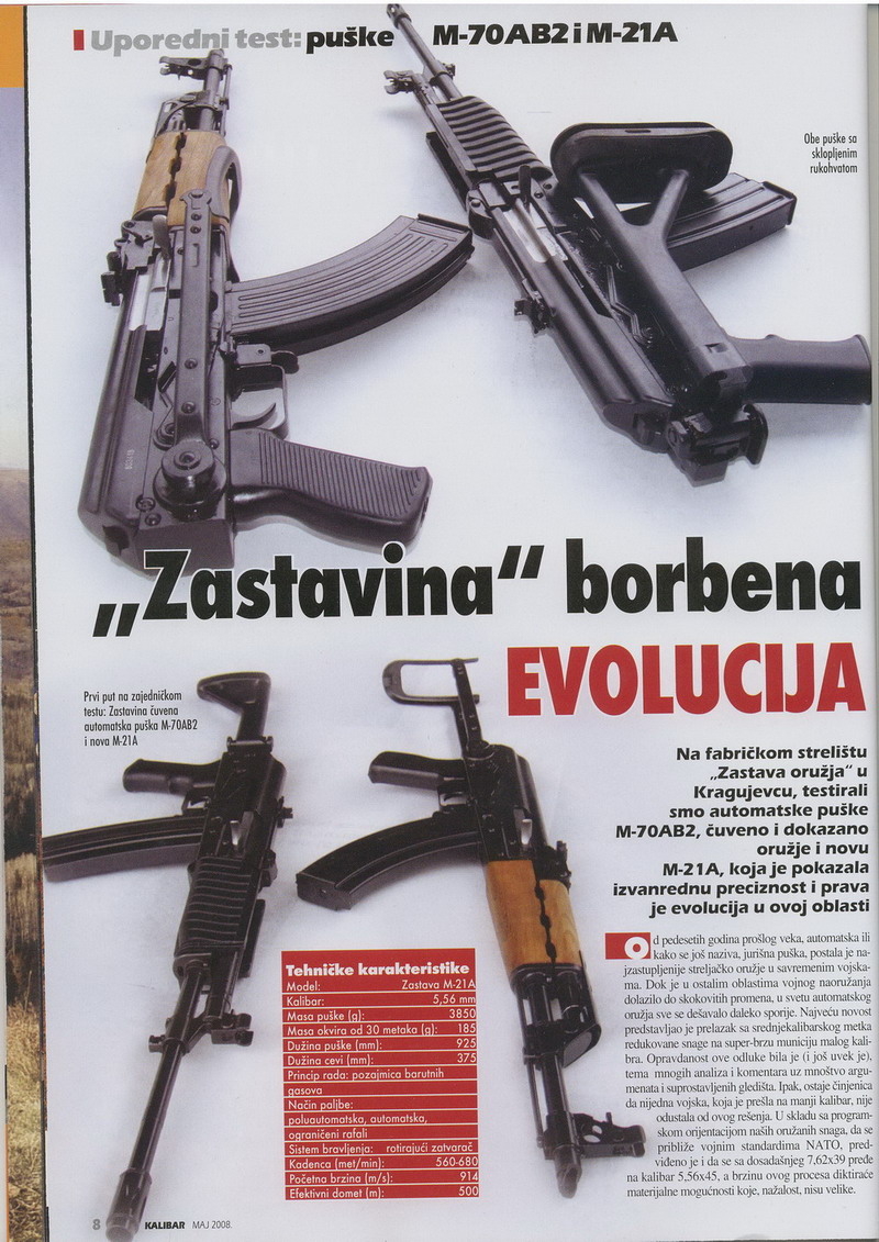 Zastava M21突击步枪是塞尔维亚Zastava兵工厂在原有AK产品基础上进行改进,发射5.56mm北约标准弹。标准型M21的枪管长460mm,卡宾型M21S的枪管长375mm,枪管镀铬。折叠枪托上可增加的可调式贴腮板或橡胶托底板,枪上配有皮卡汀尼导轨用于安装附件,枪管下可安装改进自GP-25的榴弹发射器。