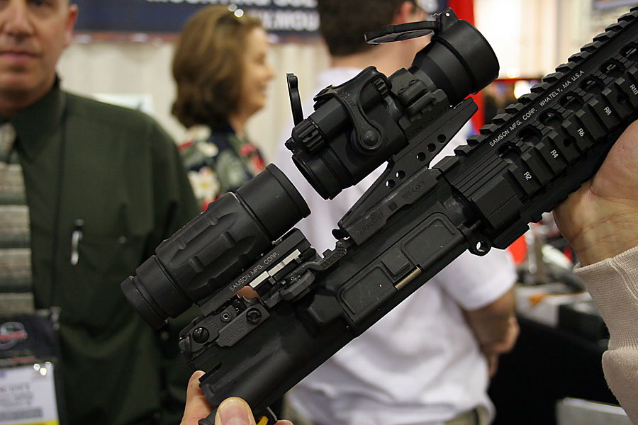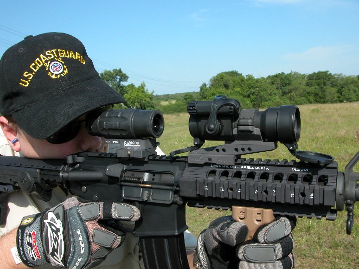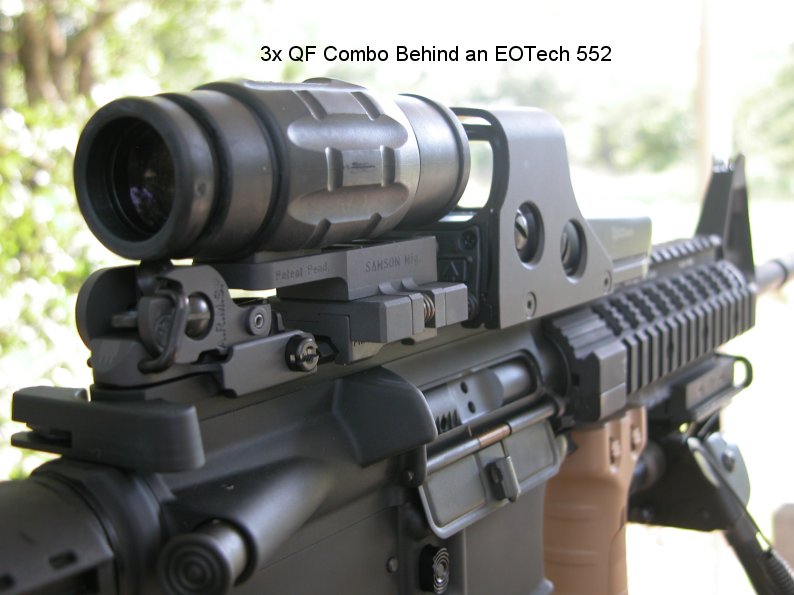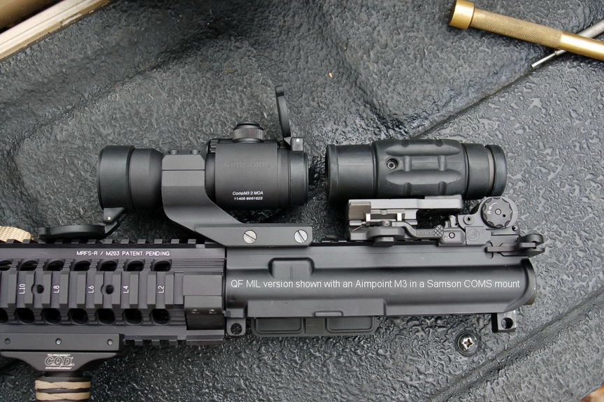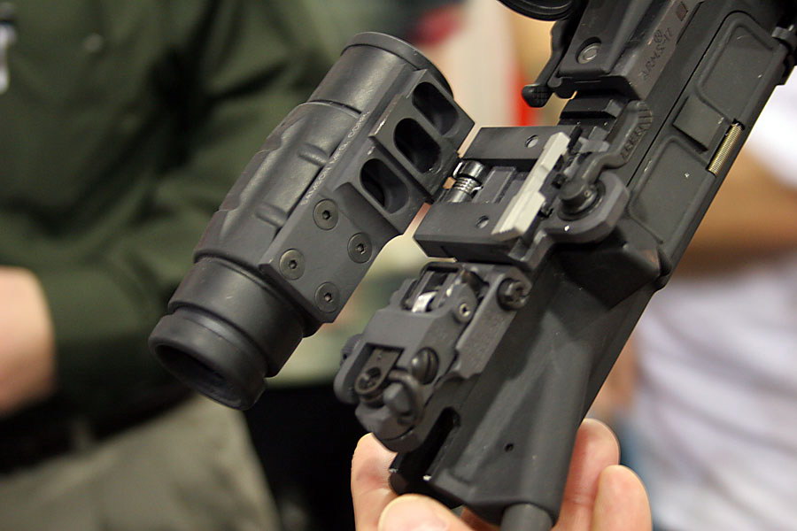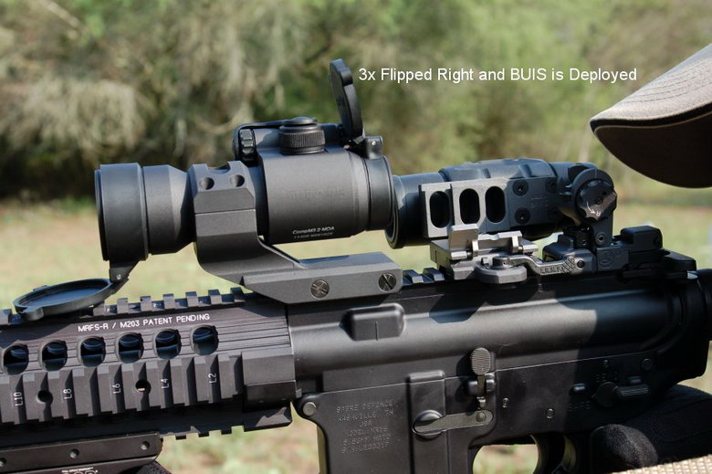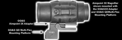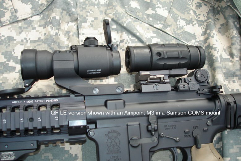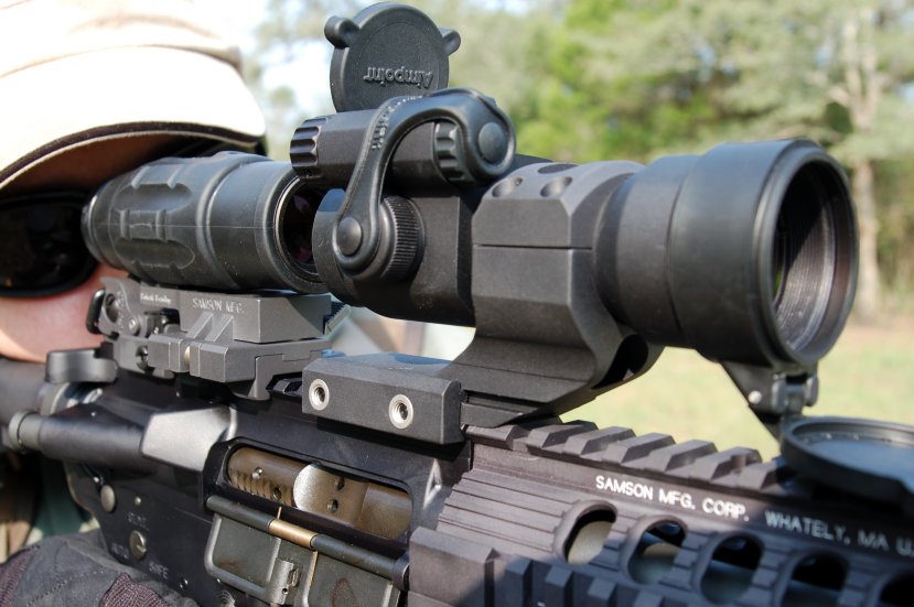 AIMPOING 3X MAG是一种与AIMPOINT红点镜同轴串联起来使用的3倍望远镜,通过专用的镜架安装在红点镜的后面,使红点镜也具有放大3倍瞄准的功能,特别适用于光点尺寸为2MOA的红点分划进行中、远距离瞄准射击。3X MAG本身也使用高强度铝合金,外表包覆有橡胶缓冲套,外形尺寸为110×44×41mm,重仅200g,与COMP M系列红点镜一样,可在零下45℃至零上70℃的环境中使用,有20米防水能力。3X MAG的专门镜架可以翻倒在机匣的一侧,在近距离射击时可以只使用原来的1倍红点镜来保持快速瞄准的能力。