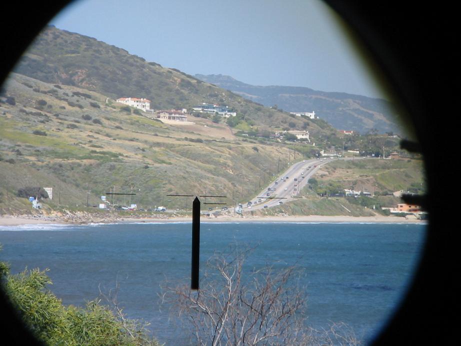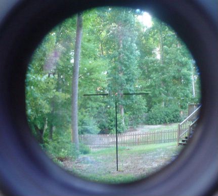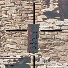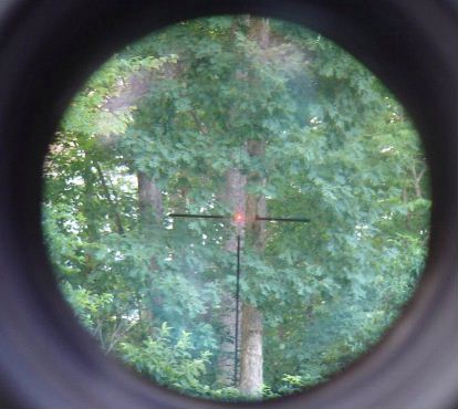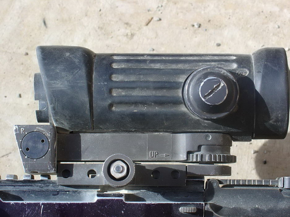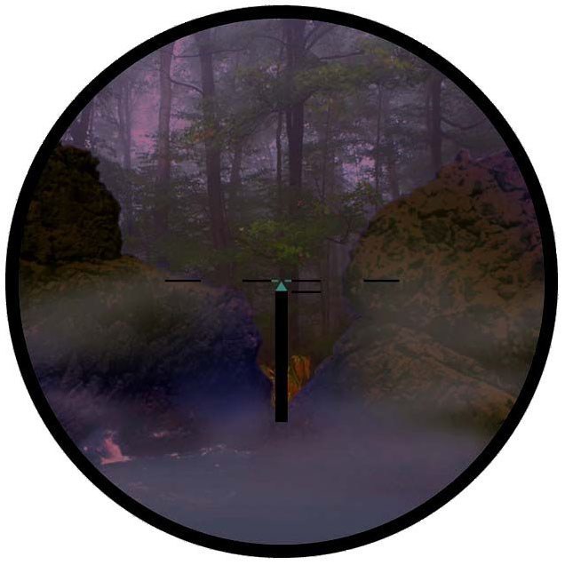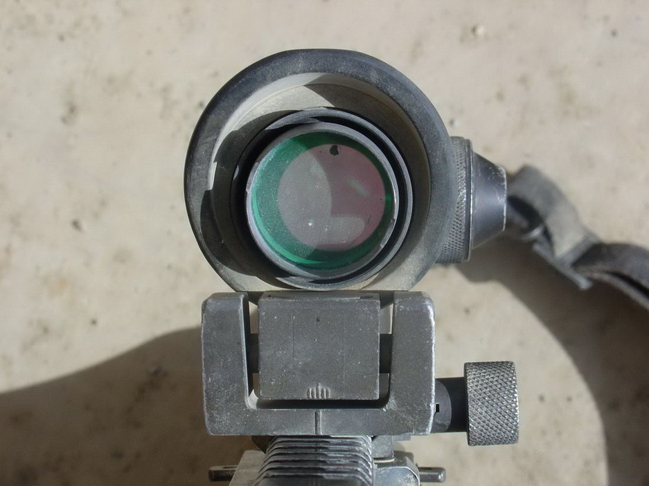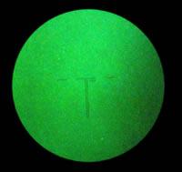 ELCAN的分划,在昏暗环境下使用时,顶部的三角形由氚光照明。右图为夜间通过微光夜视镜使用时的图像