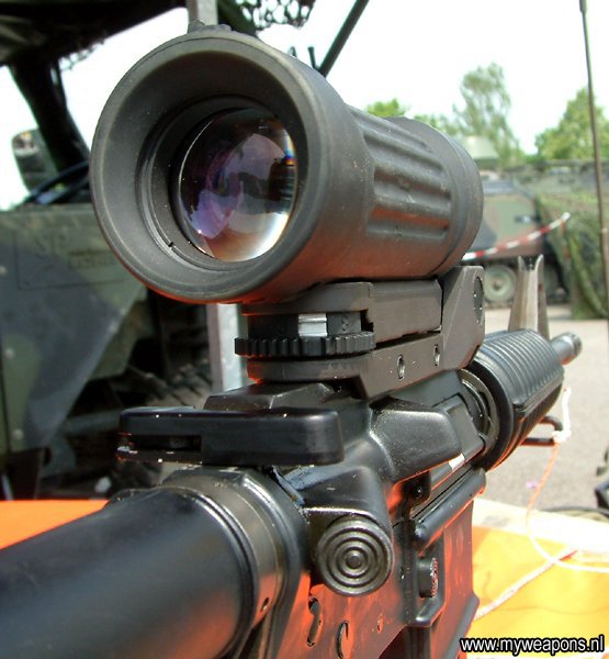 这种瞄准镜是加拿大一家名为ELCAN(Ernst Leitz Canada)的光电仪器公司的产品之一,这种型号的名字叫ELCAN Specter OS3.4x。放大倍率为3.4倍,镜体非常坚固,外表覆上一层橡胶膜,瞄准镜顶部有后备的简易机械瞄具,可以安装在MIL-STD-1913标准的导轨上。由于ELCAN望远式瞄准镜可以双眼瞄准,使用简单,训练容易,视场宽阔,因此在1989年被加拿大军方采用,命名为C79瞄准镜,普遍用于C7A1步枪和C9A1轻机枪上。