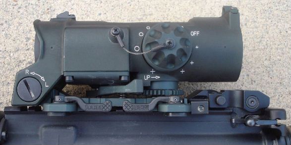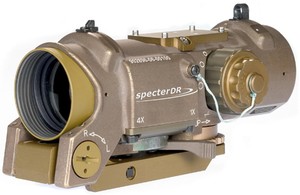 ELCAN SpecterDR有1-4x和1.5-6x两种,目前1-4x正在被美军特种部队所采用。DR是双重角色(DUAL ROLE)的缩写,这种瞄准镜既可以以低倍率用于近距离战斗,也可以用放大倍率进行远距离的精确射击。幽灵DR的固定镜组是放大功能,但中间有一个旋转透镜,通过旋转其90度达到变倍的目的。幽灵DR的底座内有电池盒,用于提供分划照明。目前美军特种部队中对于幽灵DR的评价是两极分化,要么极其喜爱,要么极其恨(很多人都说ARMS的快拆不耐操)。