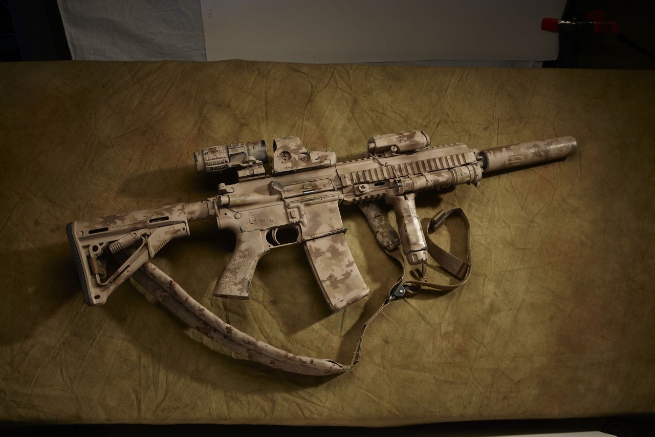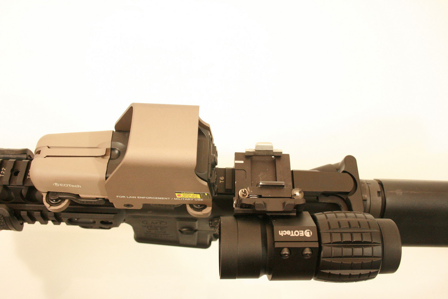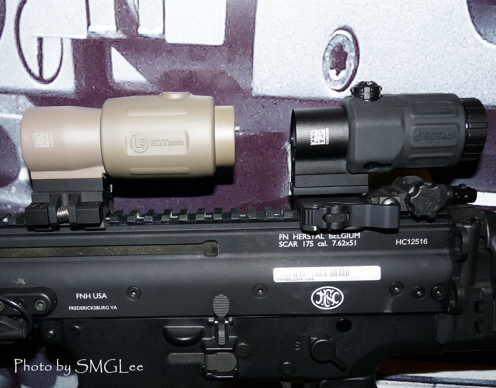 比G23更早的,L3公司提供的配套倍增镜没有正式名称,一般就叫Eotech三倍侧翻增倍镜,图为2012年出书的退役DEVGRU队员Matt Bissonnette介绍他参与海神之矛行动中的装备,其HK416D上就安装着这种早期的L3倍增镜