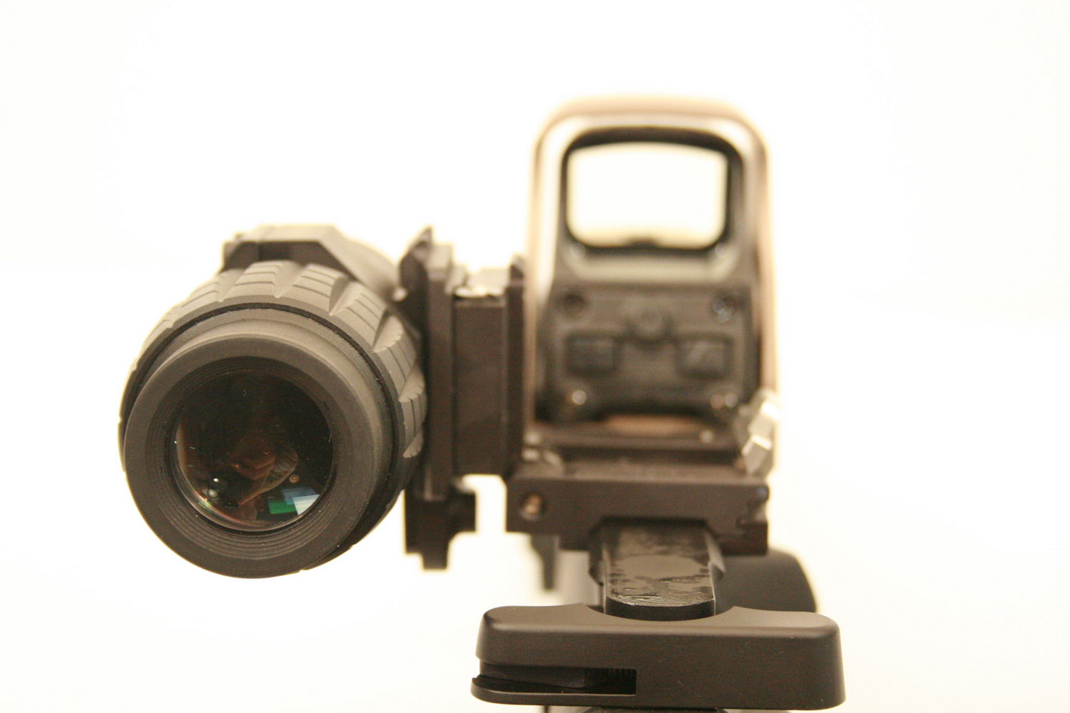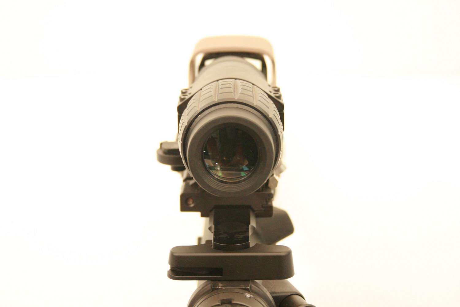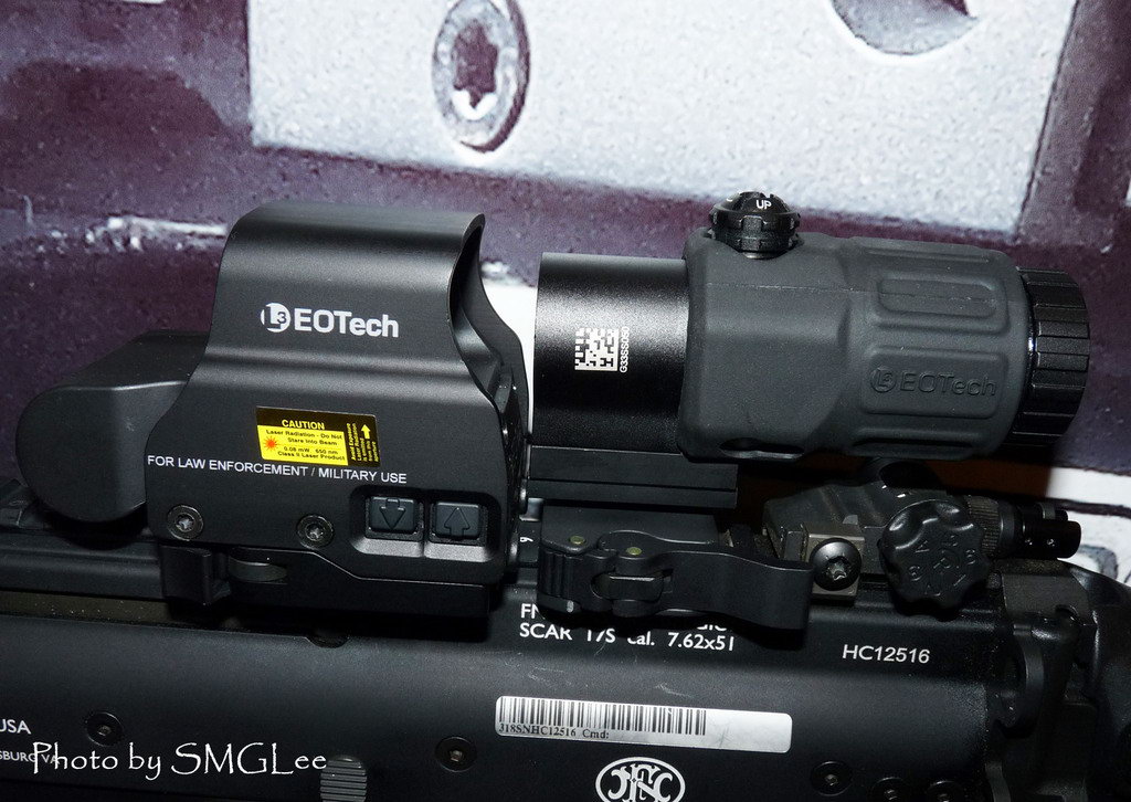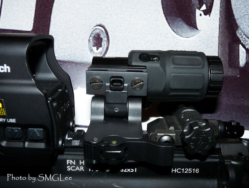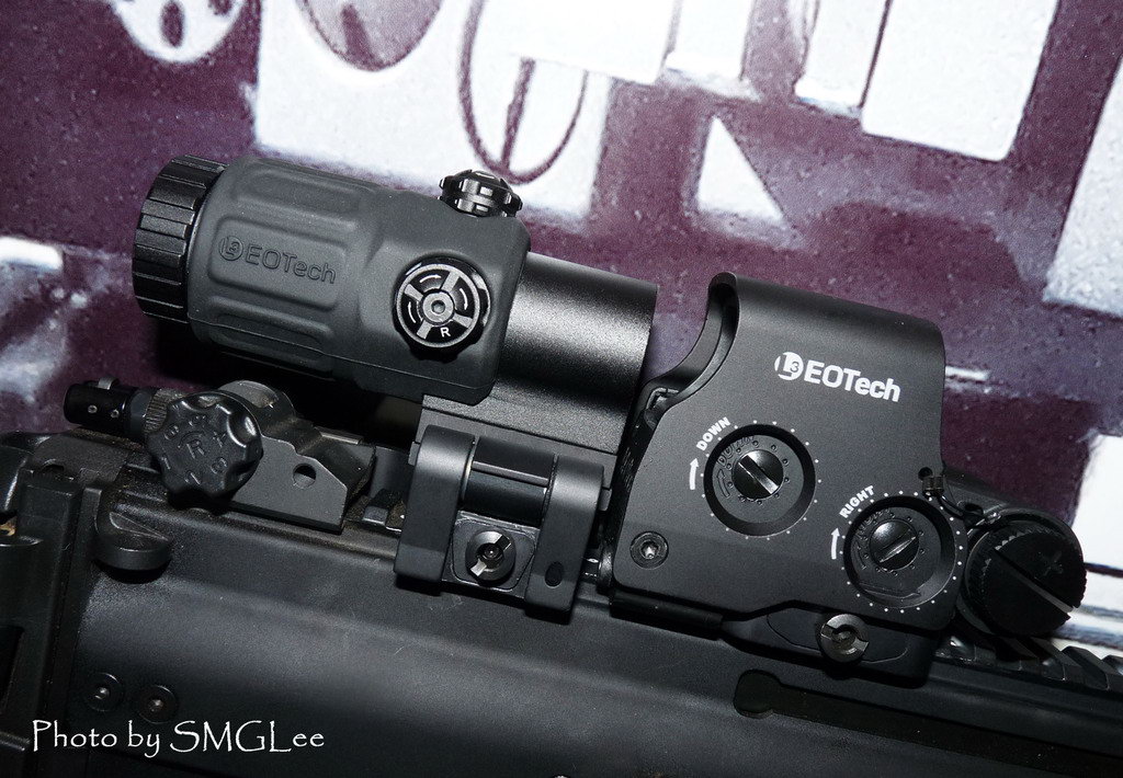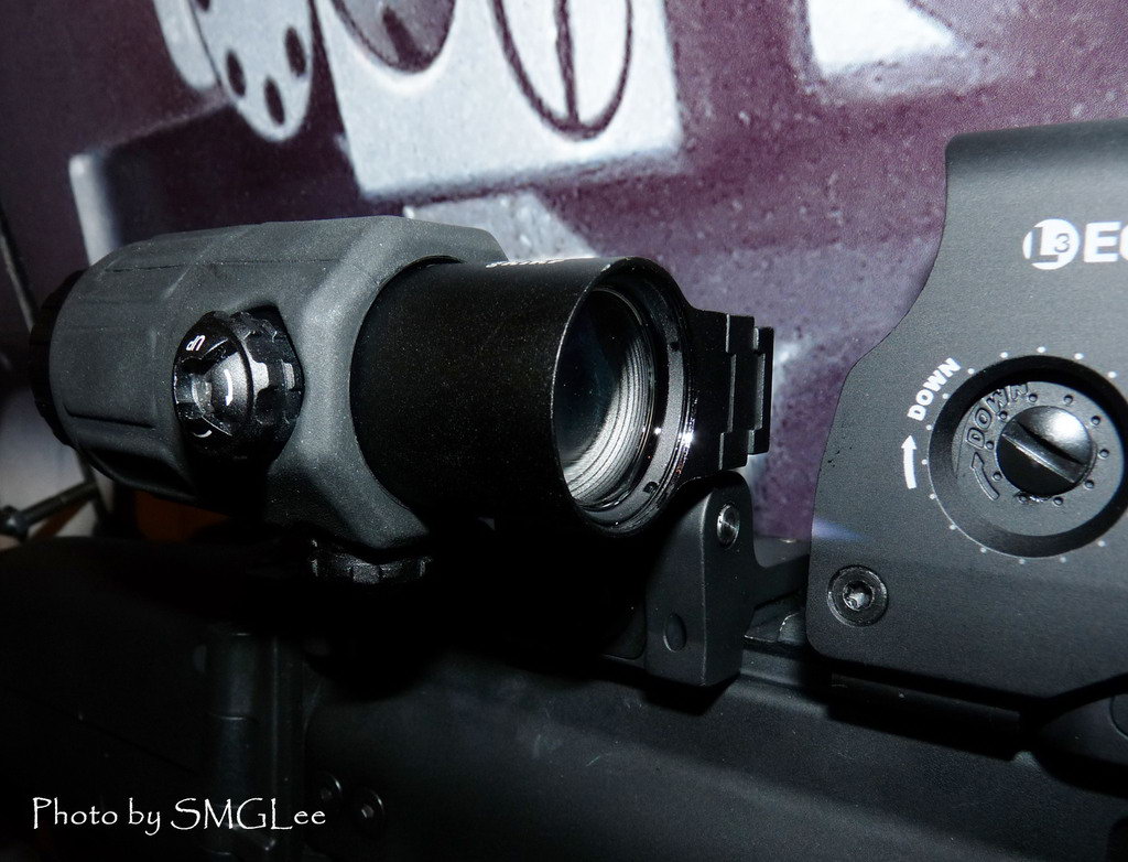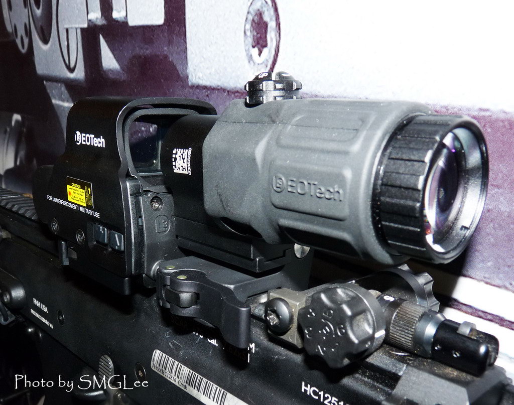 G23是一种无分划的3倍望远镜,装在EOTech后面,当需要向较远距离准确射击时,可以使用这个望远镜放大瞄准画面,而在近战中需要快速瞄准时,可以把G23折到右侧,让开EOTech的瞄准线。放大倍率为3.25倍,长117mm,重372克。