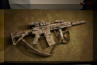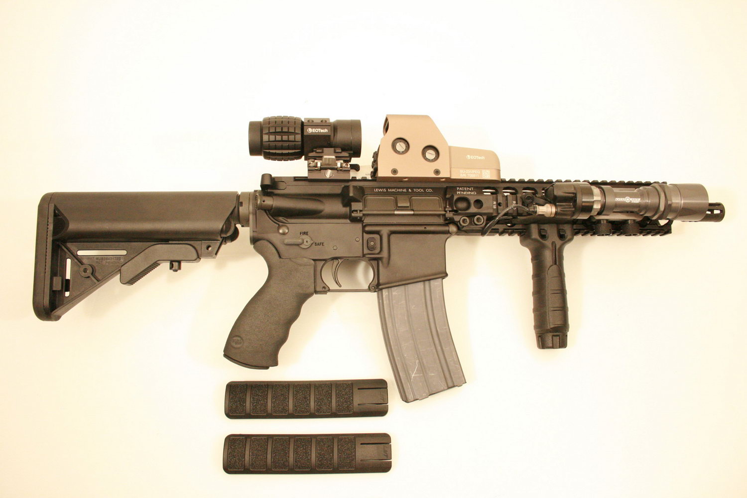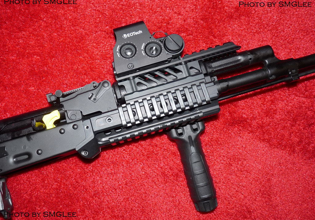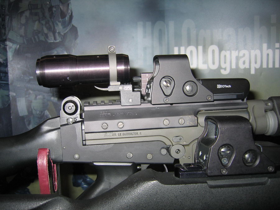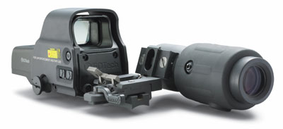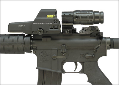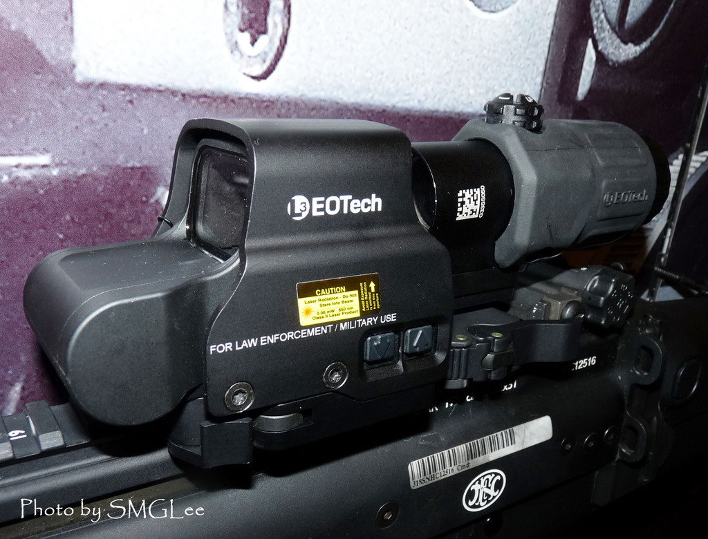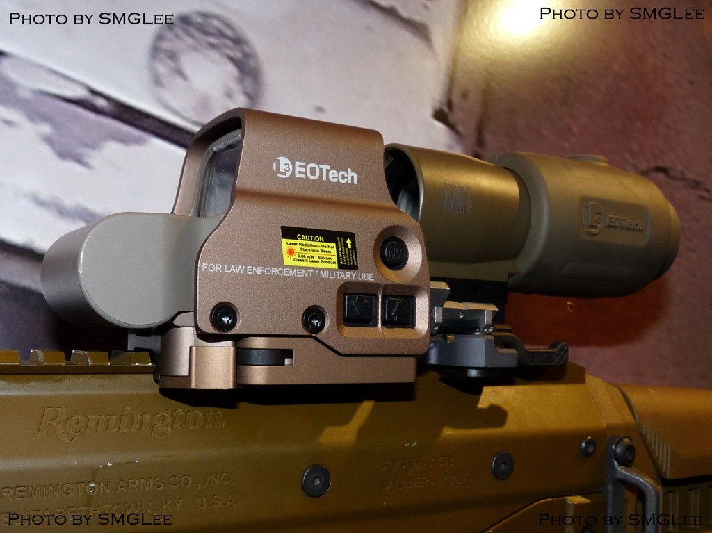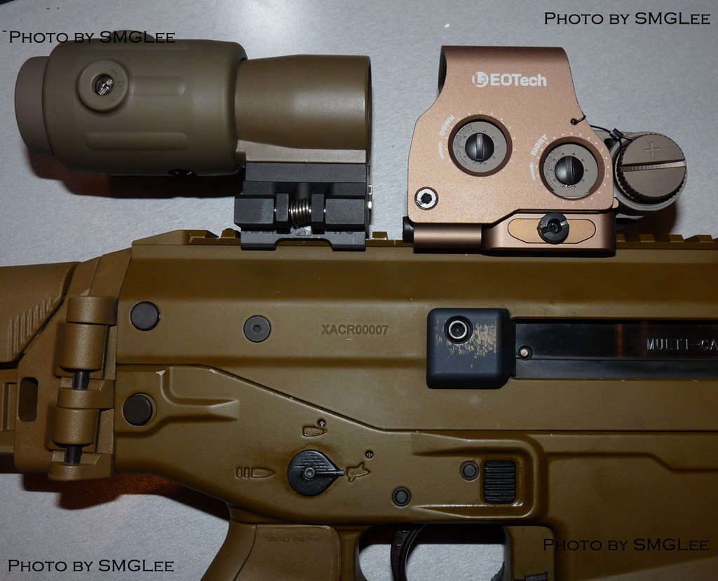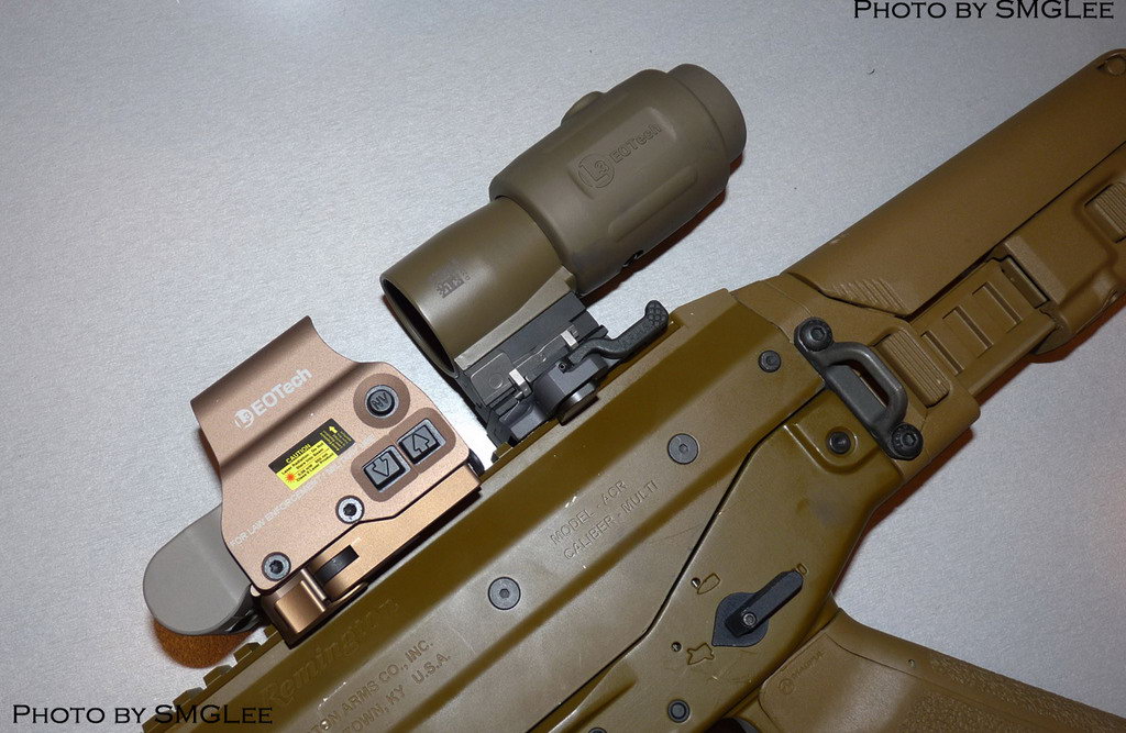 G23是一种无分划的3倍望远镜,装在EOTech后面,当需要向较远距离准确射击时,可以使用这个望远镜放大瞄准画面,而在近战中需要快速瞄准时,可以把G23折到右侧,让开EOTech的瞄准线。放大倍率为3.25倍,长117mm,重372克。