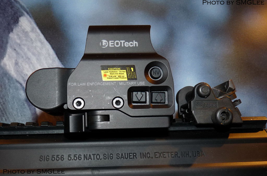 EOTech 556系列是553系列的进一步改进,主要的改进是把开关从背面移到左侧,在全息瞄准镜后面串联安装3X MAG或夜视镜等装置时会更方便。与553系列一样,同样是使用两节CR123A电池,尺寸为130×53×71mm,重372克。这个系列的民用型为516系列,外形几乎一样,尺寸稍有差别,但最大的特点是取消了配合夜视仪的红外分划功能。