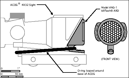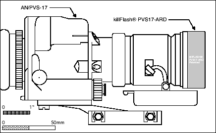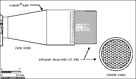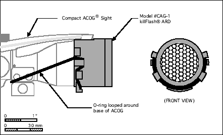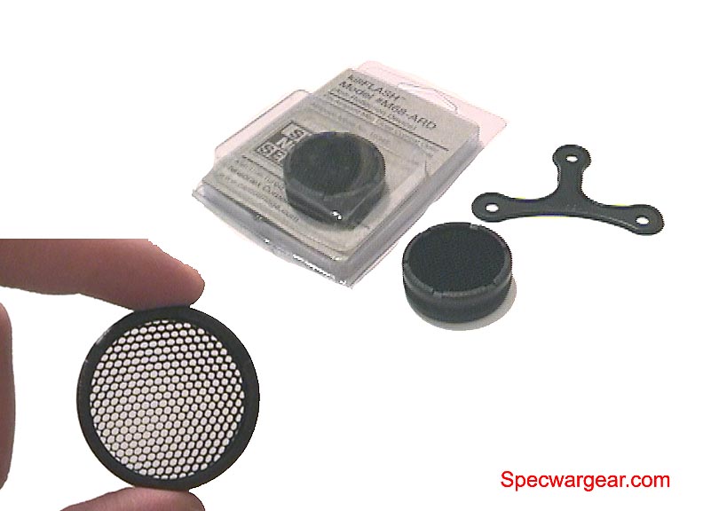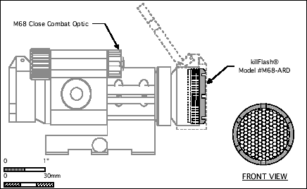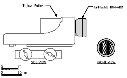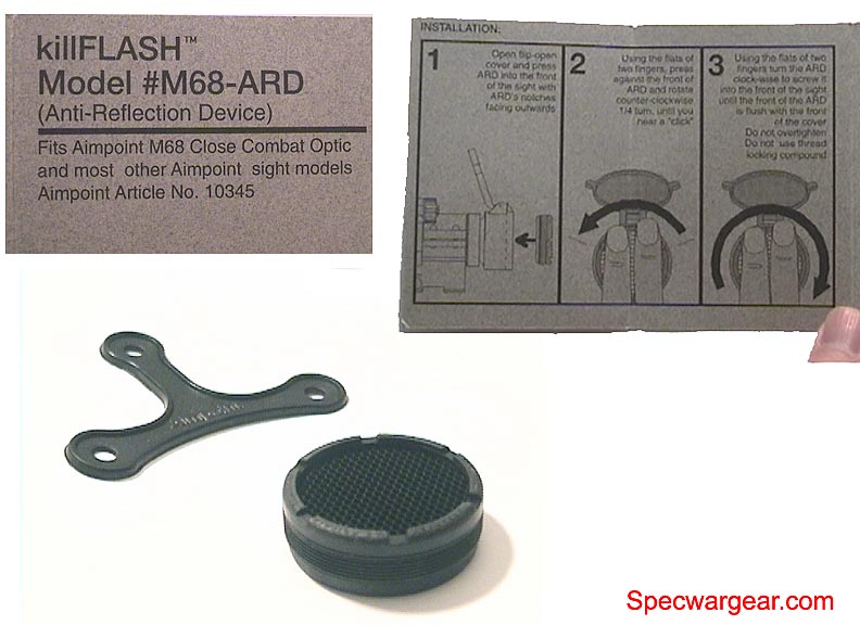根据官方的宣传资料,以一个直径74mm的M144狙击手观瞄镜的镜片为例,一个killFlash® ARD的效果相当于一个889mm长的传统遮阳管的效果。不过有得必有失,killFlash® ARD的缺点是这种蜂巢形滤光板会减少镜片前的光通过率,据说大约会减少15%。不过无论如何,killFlash® ARD的隐蔽使得它一面世就获得特种部队的青睐,美军的特种部队是最先在他们的ACOG上安装killFlash® ARD的,现在其他常规兵种的地面战斗部队都已经采用了killFlash® ARD作为防反光材料,装在望远镜和瞄准镜上。