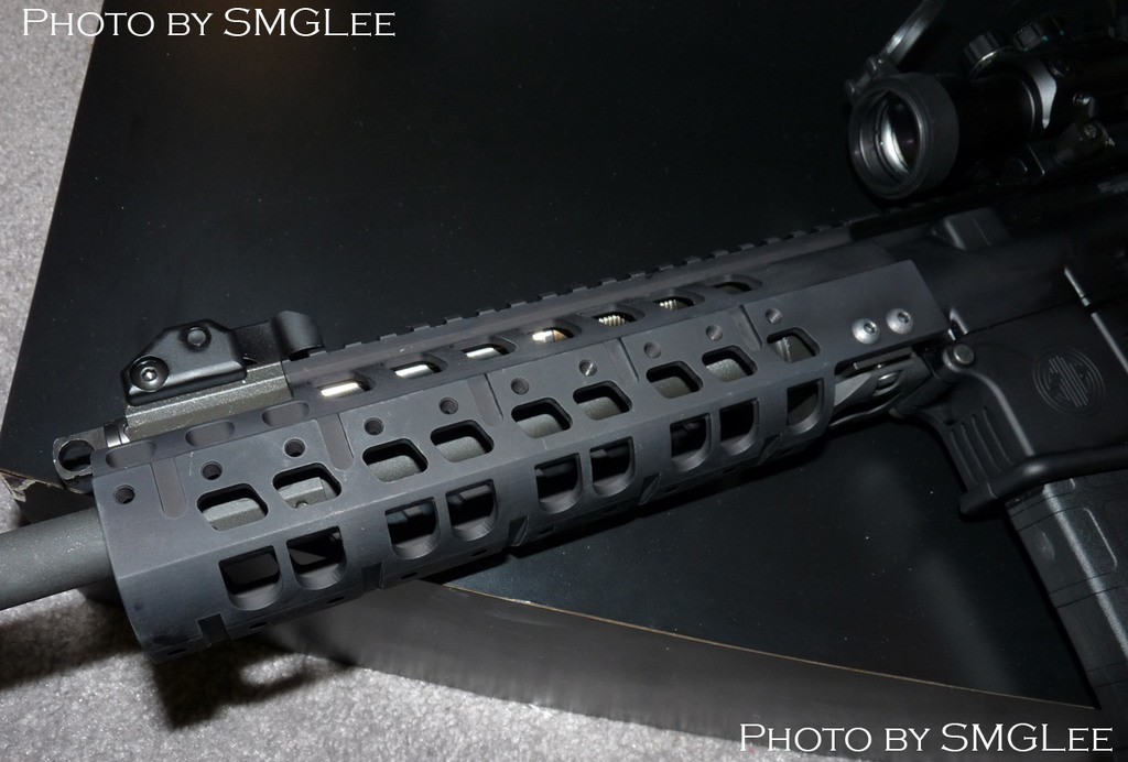 最初SIG516/716的护木是采用四面导轨的(顶部、左右两侧和下方),由于这几年潮流再次发生变化,开始流行起只有顶部导轨的轻型护木,于是SIG公司在2014年也推出了新的SIG516/716轻型护木,轻型护木有两种材料,一种是完全由铝合金制成,另一种是上半截铝合金下半截碳纤维材料,两种新护木都只在顶部有整体式皮卡汀尼导轨,左右侧和底部在需要时才加装一小段导轨。