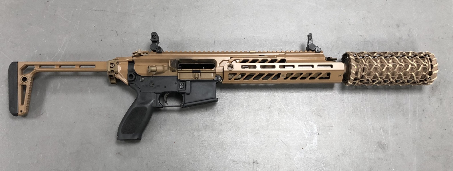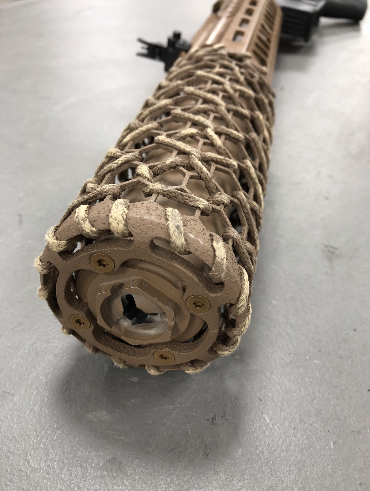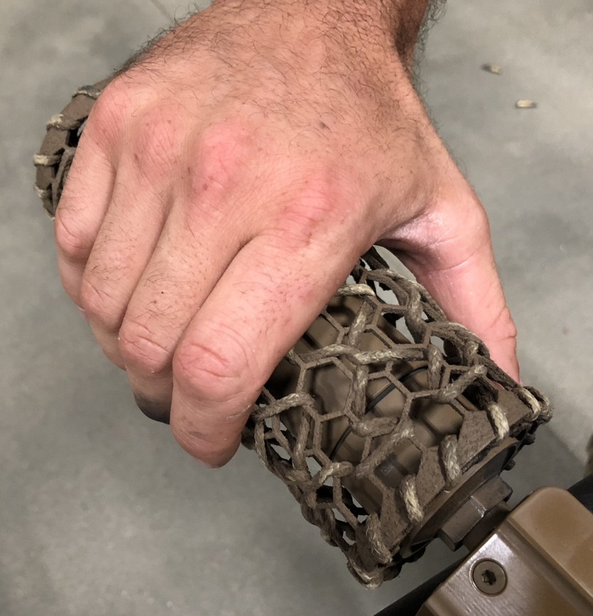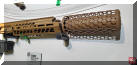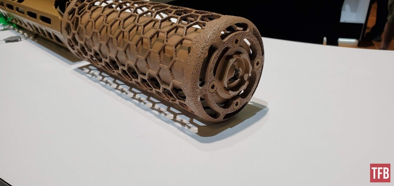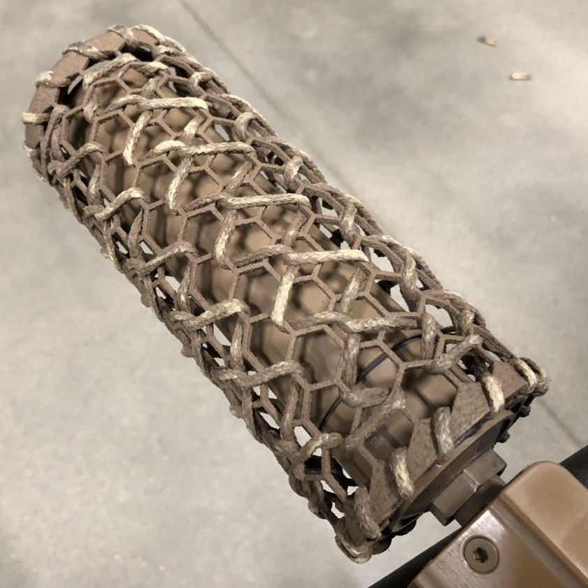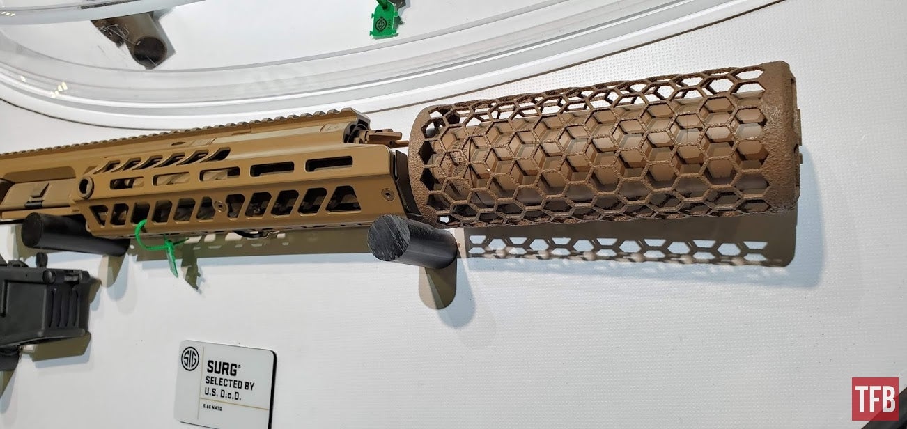 SURG的消声器外形非常独特,有一个笼状的外套,这是用芳纶材料制成的隔热网,因为消声器在大量射击后,表面温度会非常高,不小心就会烫伤自己,或烫坏尼龙装备。这个隔热网就可以避免直接接触到外表灼热的消声器,其实这就和LVAW使用较长的护木包裹住消声器的后半部分是一个目的,防止灼手。国外有枪械作者在参与美国SIG公司的体验活动时,直接用手摸到大量射击后的消声器上,表示没有烫伤(但他也写了免责声明:不建议大家模仿)。