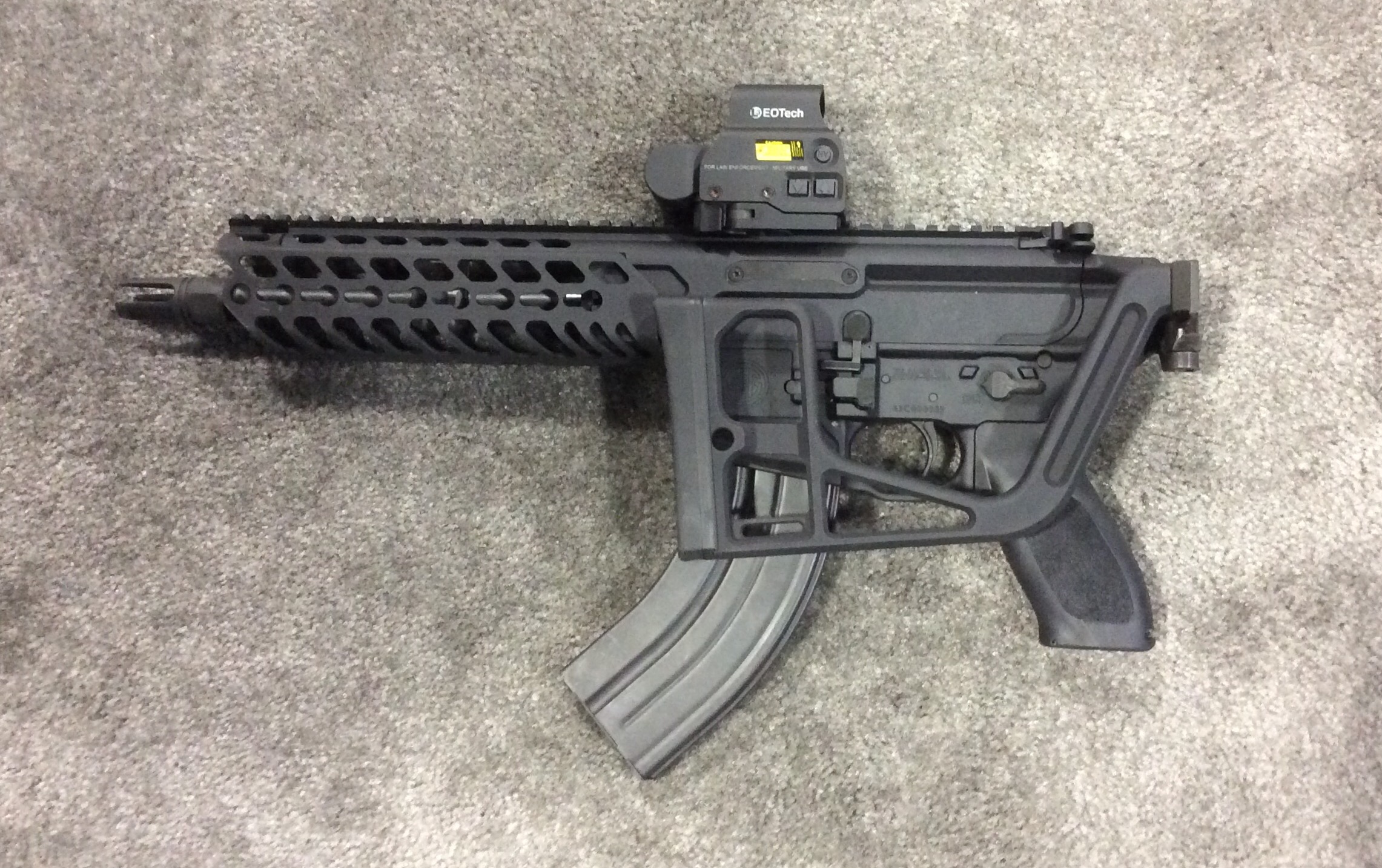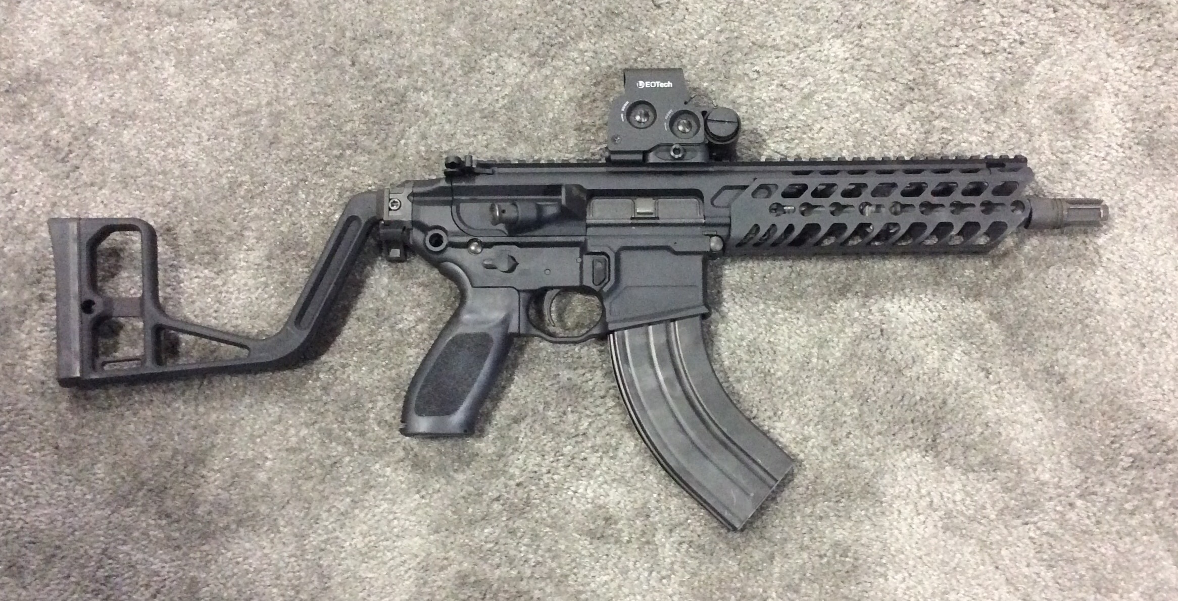 由于原本的铝合金侧折叠枪托的舒适性不好,SIG后来推出了这种既可伸缩也可折叠的新枪托
