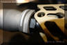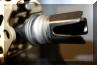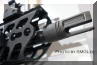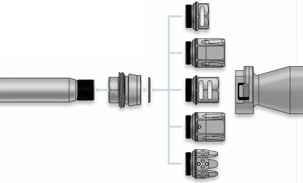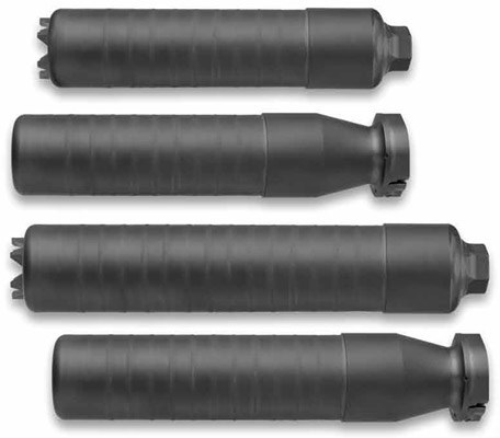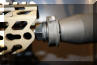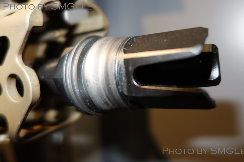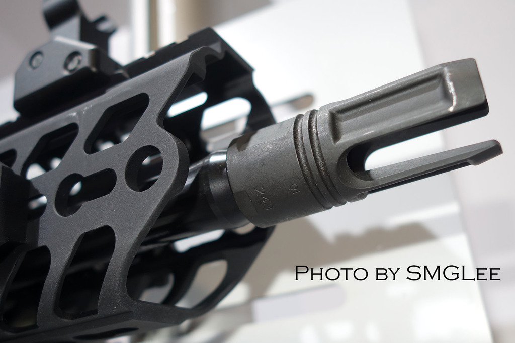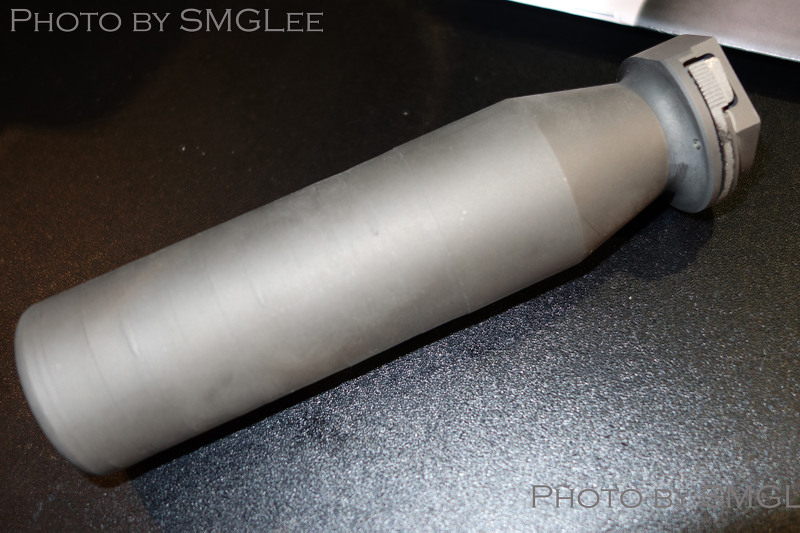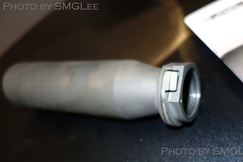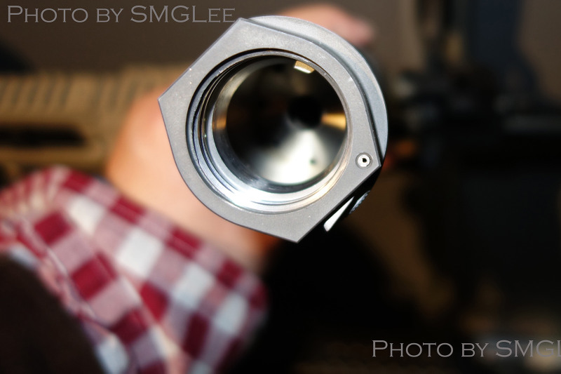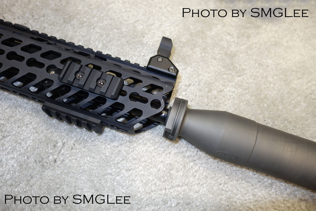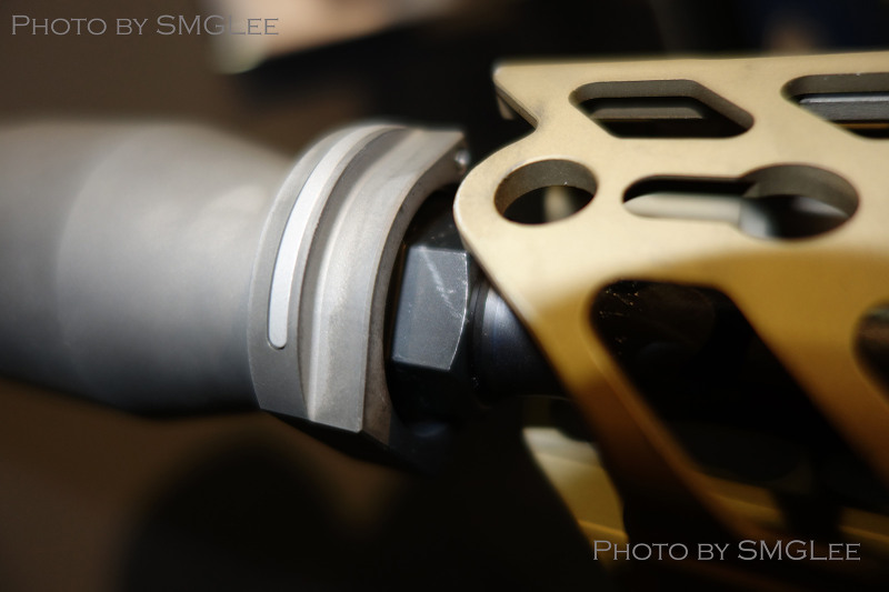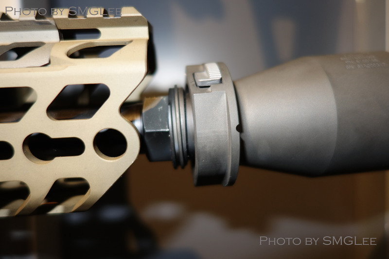 SRD QD消声器的安装方式,首先在枪口安装上一个QD消焰器锁紧用的螺帽,然后把枪口消焰器或制退器等其他平时用的枪口装置螺纹到锁紧螺帽上。当需要使用QD消声器的时候,按下消声器根部的锁紧按钮便可直接套在整个枪口装置上,松开锁紧按钮就能固定在枪口上
