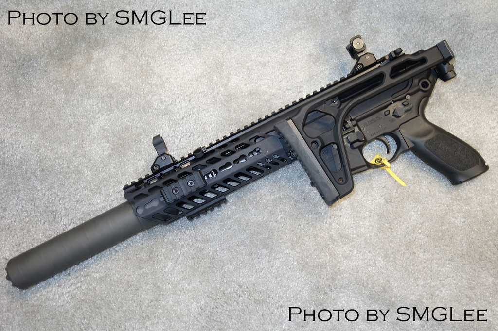 据说在当时美军特种部队对AAC公司研制的.300 BLK亚音速弹很感兴趣,很可能会采购发射.300 BLK亚音速弹的消声武器代替MP7A1和MP5SD作为“摸哨武器”。除了AAC公司自己研制的“蜜獾”卡宾枪和各种改口径的AR式配件外,柯尔特、大毒蛇等公司也有推出.300 BLK口径的短枪管AR,而SIG公司也在2012年推出了.300 BLK口径的短枪管SIG516。但要取代MP7A1和MP5SD的另一个关键是武器要非常紧凑,而传统AR式步枪因为枪托的一半要容纳缓冲管而只能折叠一半或伸缩一半,即使是“蜜獾”,其下机匣也是直接仿照AR式下机匣的设计,依然是有缓冲管这个传统AR式的复进装置。
