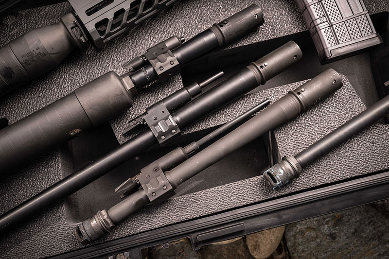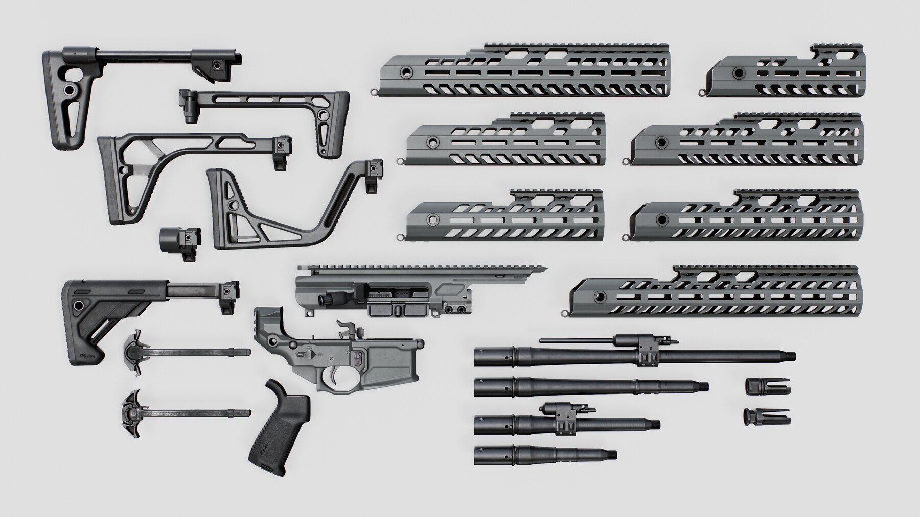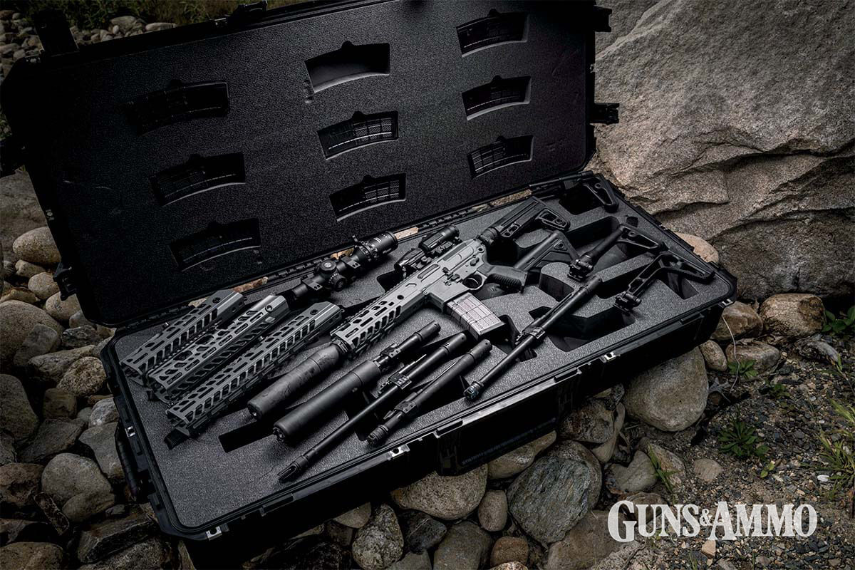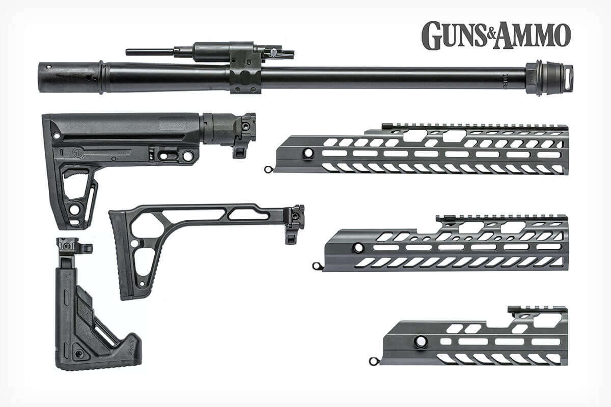 5.56 NATO和.300 BLK的枪管组件可以互换。SIG-Sauer还提供了一套称之为“突击手工具包”(assaulter's kits)的配件套装,是在一个派力肯箱子里放上一套不同长度的5.56mm和.300 BLK枪管,并配有不同款式的护木和枪托,及几种瞄准装置和消声器,一支枪配一套,宣称用户可以在几分钟内将一把16英寸枪管配LPVO瞄准镜的精确射击型步枪变成一把9英寸枪管的隐蔽携带的PDW,也可以把一把5.56步枪变成一把.300 BLK摸哨枪。不过有些宣传软文里也很贴心地告诫潜在的民间用户买家:如果你买的是一把16英寸的巡逻步枪版本,当购买这套突击手工具包时,最好要有其他如SBR步枪之类的相关资格,否则你自己一改装就犯法了。官方宣传材料中还提到,MCX Virtus通过更换不同的配件或不同的颜色,有500多种组合,我觉得可能是换一个不同牌子的机械瞄具都算是一种组合吧。