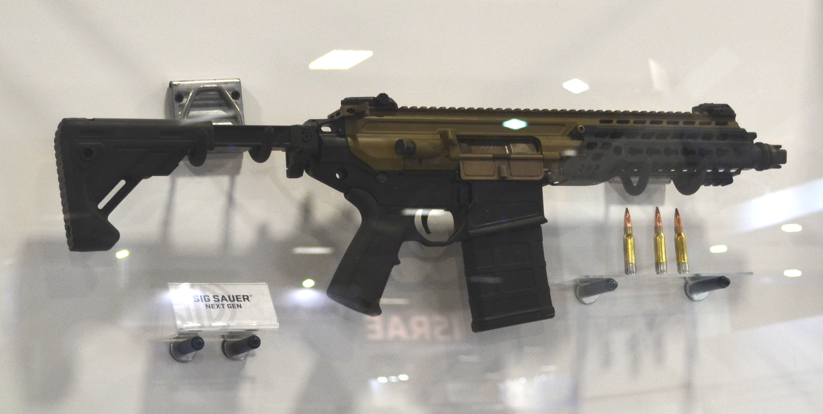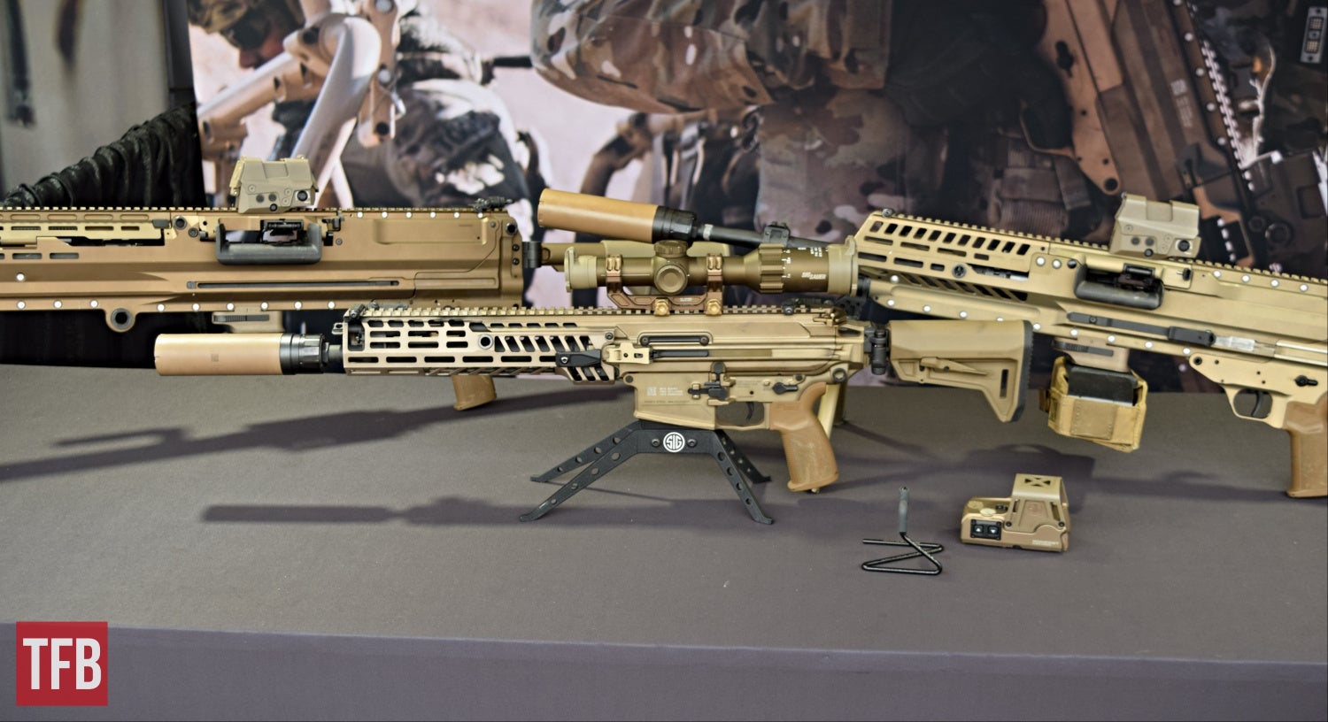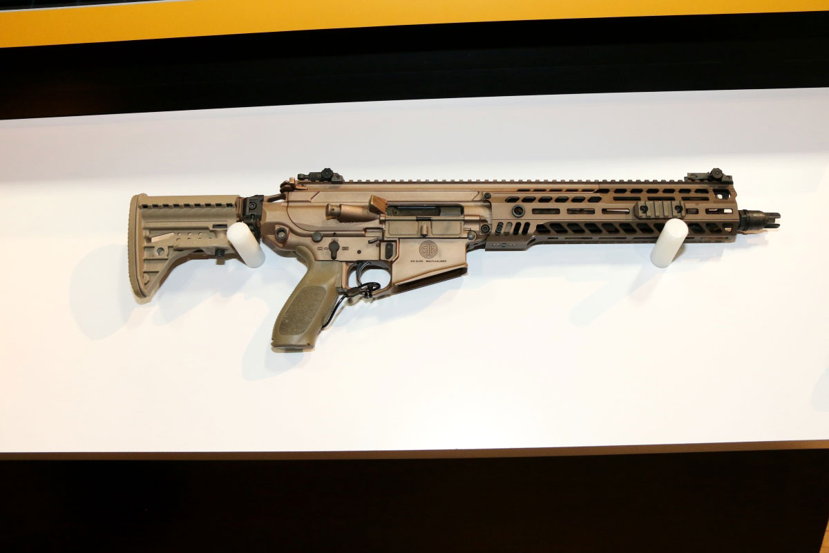 美国SIG在2021年SHOT Show上展出的NGSW原型枪:上面是新MCX-SPEAR,已经改成M-LOK护木