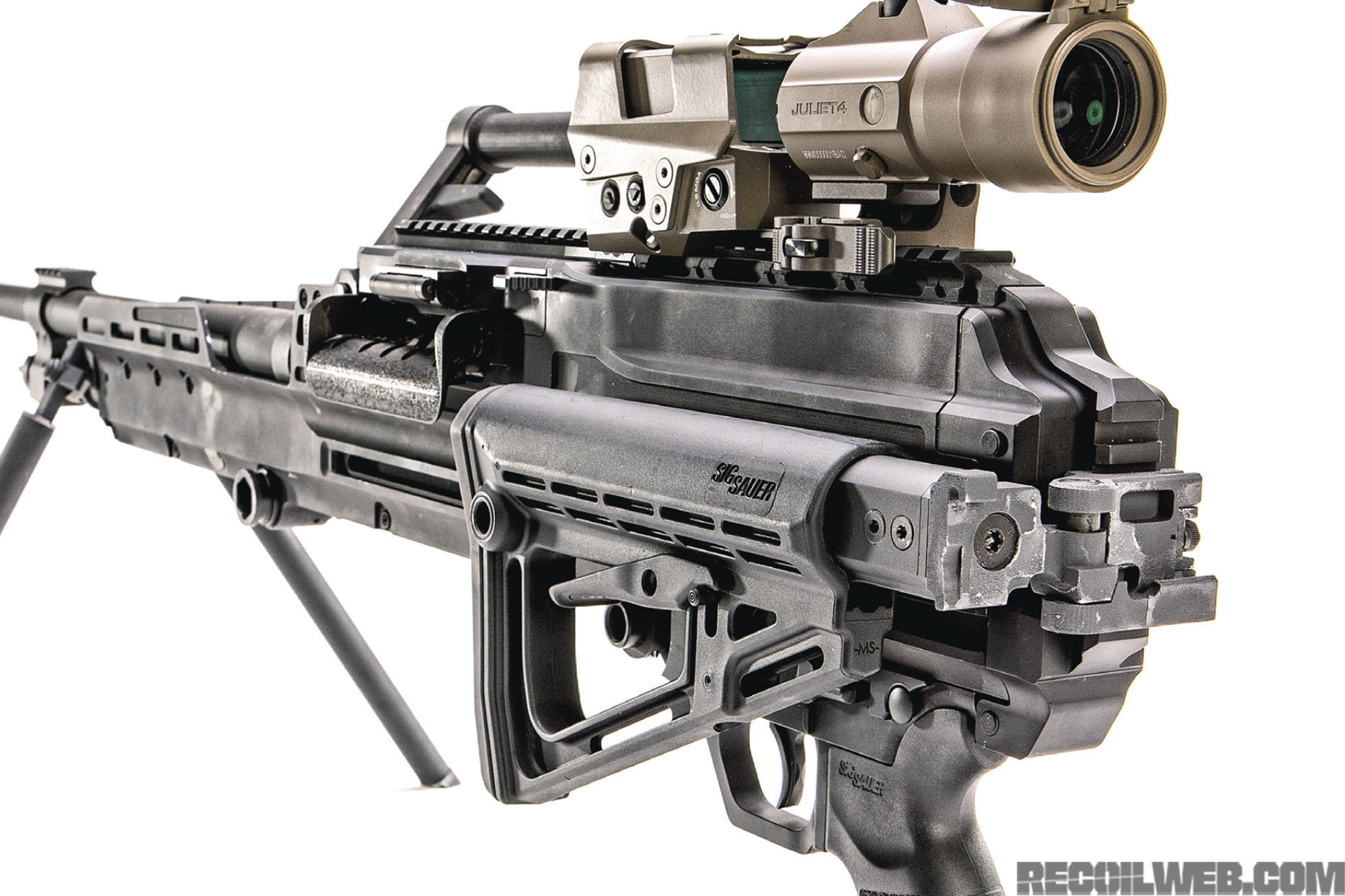 弹链从左侧装入,弹壳和散开的弹链链节从右侧排出。机匣两侧都有拉机柄槽,可由射手根据自己的操作习惯选择拉机柄装在左侧还是右侧。枪身下方可挂上随枪将硬式弹链袋,弹链袋的容量有30发、50发或100发三种。另外也可通过安装在车辆上的大容量弹箱的柔性输弹槽供弹。为方便安装在车辆上使用,SIG MG-338机枪具有与M240机枪相同的枪架接口。但在活塞筒上也固定了轻型两脚架,两脚架可调整长度。枪托也可调节长度,不使用时还可折叠以缩短携行长度。由于.338 NM弹的枪口冲击和声光特征都较为强烈,所以还建议安装SIG自己的NGS消声器(Next Generation Suppressor)。