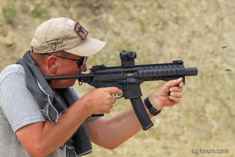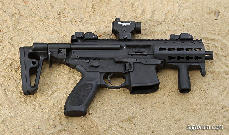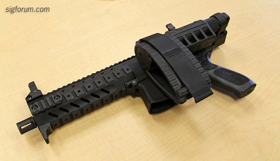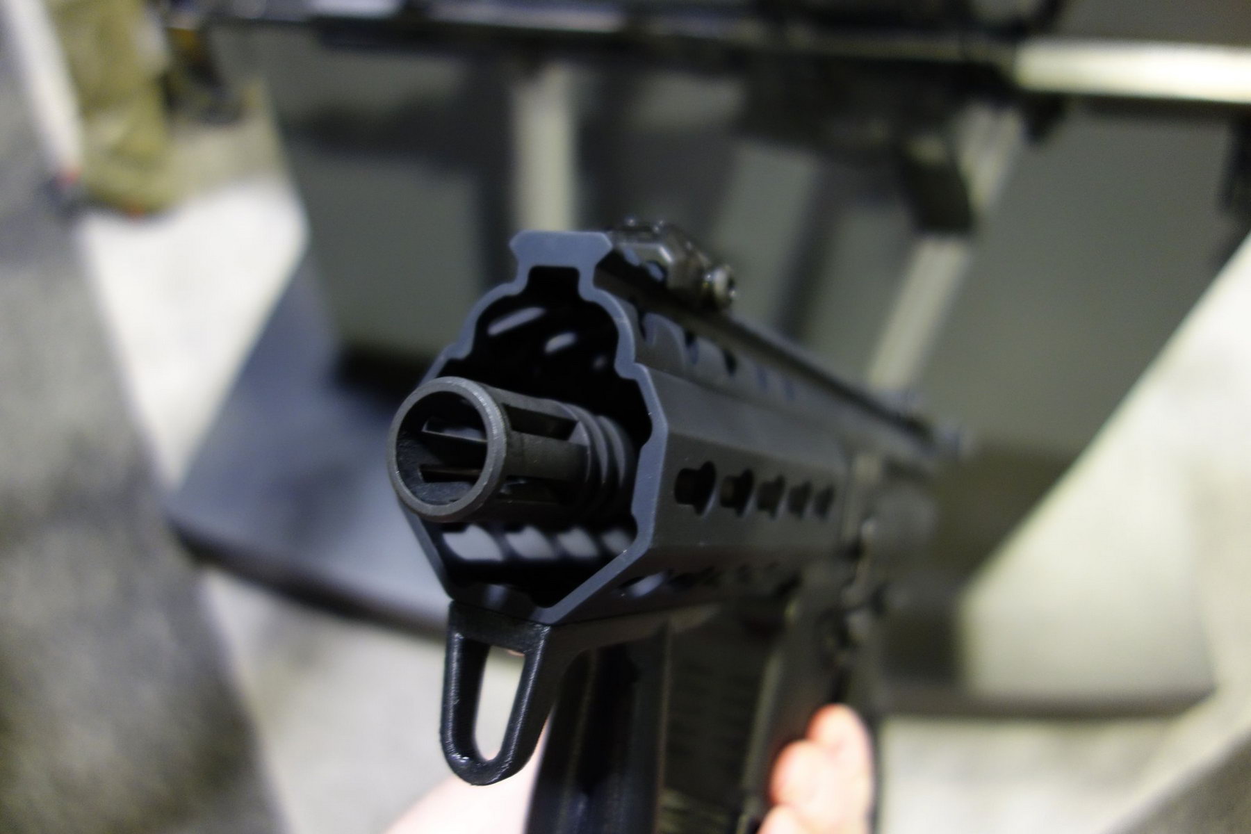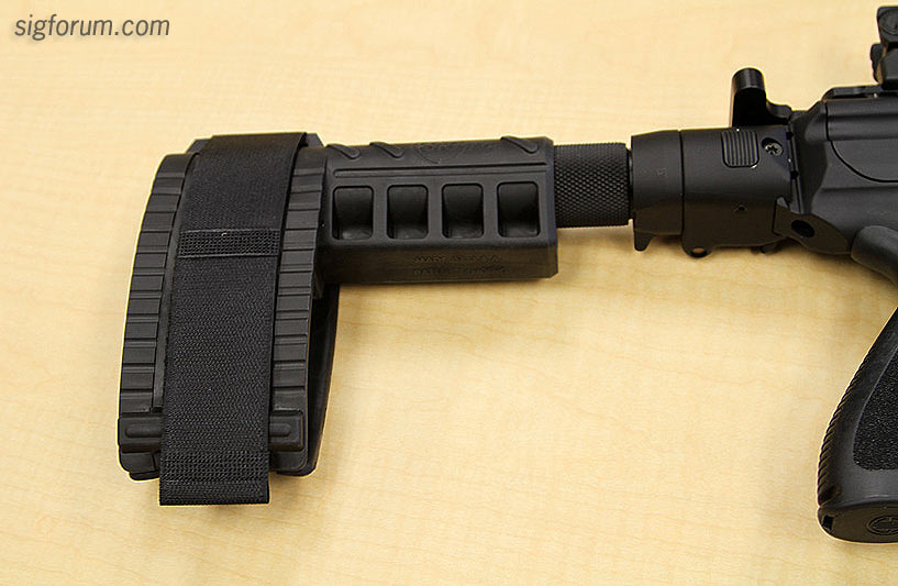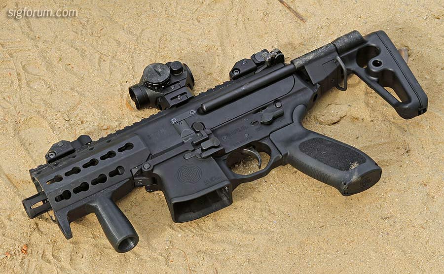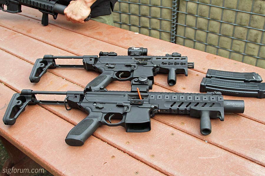 另外半自动卡宾型的SIG MPX-C的枪管也比较特别,其实是采用与冲锋枪型一样长165mm(6.5英寸)的真枪管,再加上242mm(9.5英寸)长的枪口装置,来美国枪法中规定的16英寸总长。这个枪口装置是骨架形,看上去像个拆卸了外壳的消声器,事实上SIG还提供有一个铝合金圆筒配件可以套住MPX-C的这个骨架形的枪口装置,这样看上去就真的像个消声器但没有多明显的消声效果,所以即使在禁消声器的州也不违法。不过在2014年底ATF认定SIG的Brace枪托抵肩时不合法(但不抵肩的射击动作就合法
