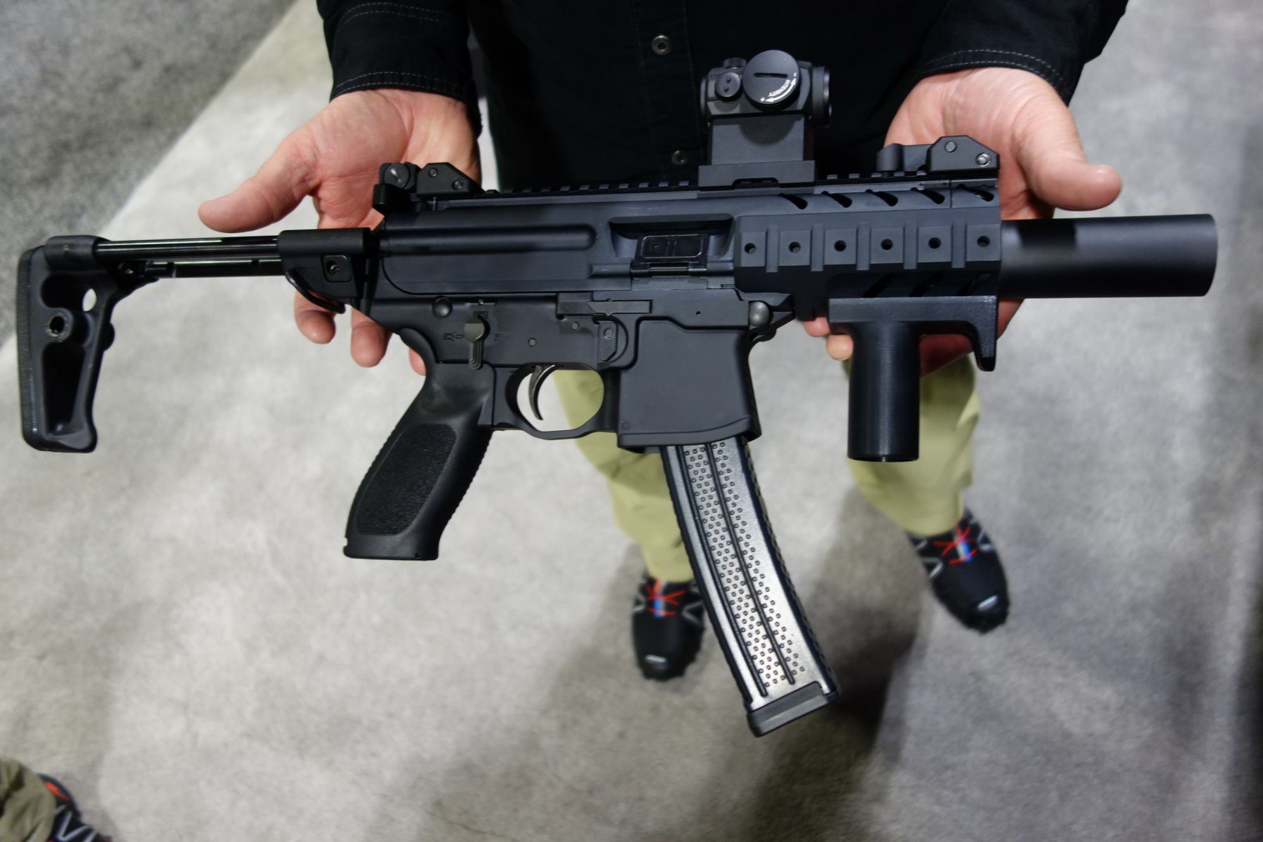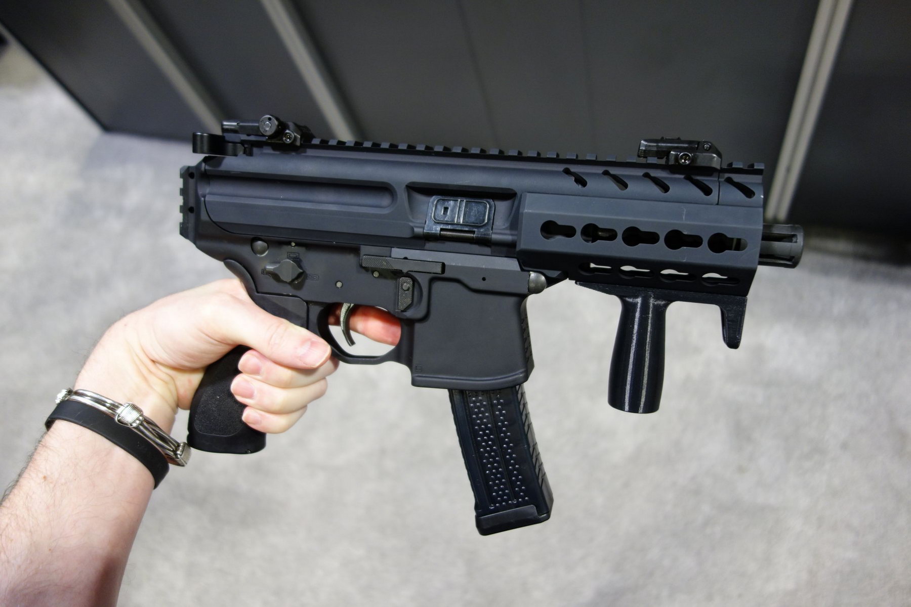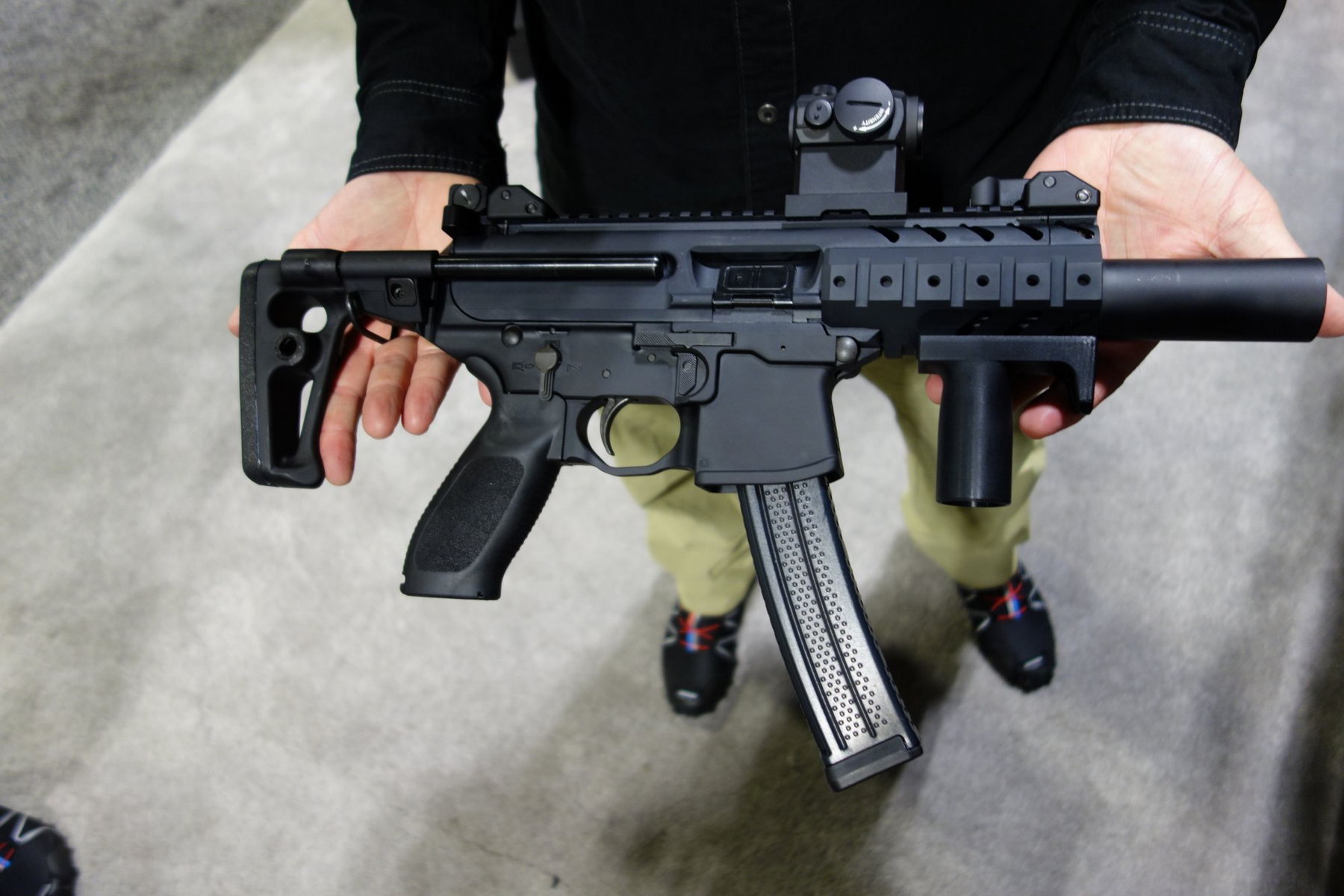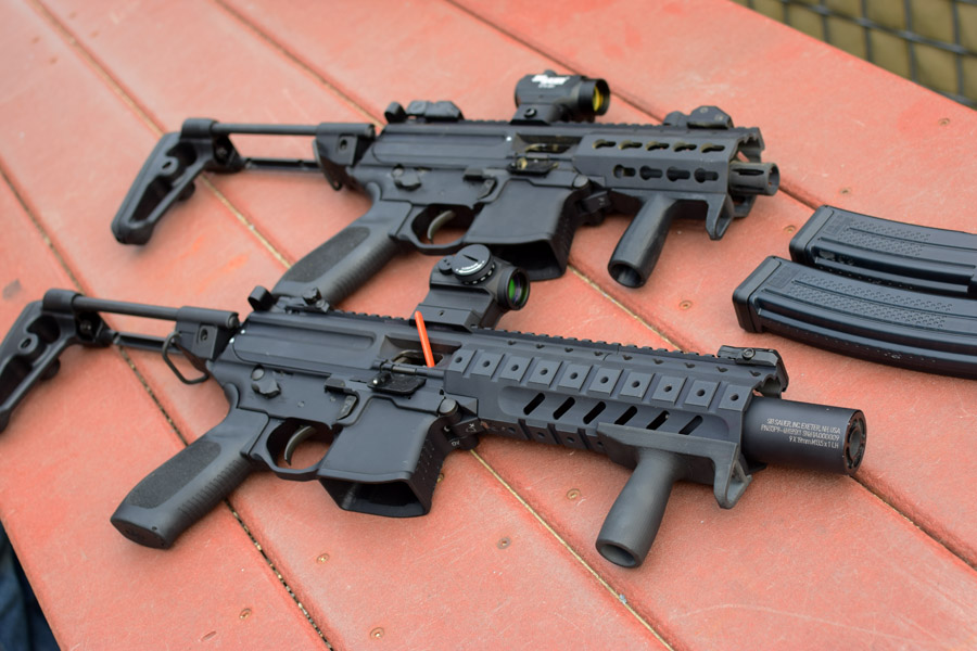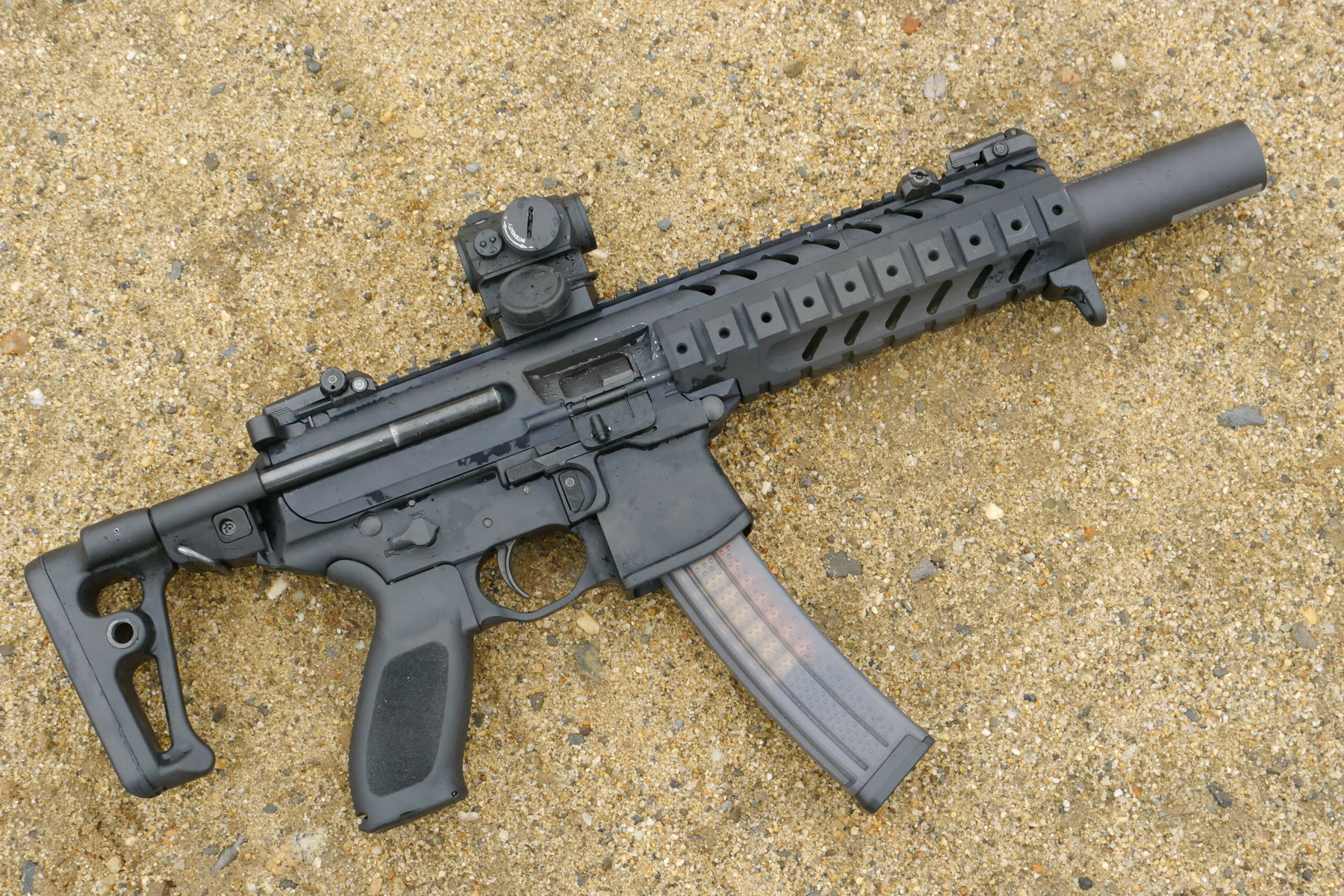 另外半自动卡宾型的SIG MPX-C的枪管也比较特别,其实是采用与冲锋枪型一样长165mm(6.5英寸)的真枪管,再加上242mm(9.5英寸)长的枪口装置,来美国枪法中规定的16英寸总长。这个枪口装置是骨架形,看上去像个拆卸了外壳的消声器,事实上SIG还提供有一个铝合金圆筒配件可以套住MPX-C的这个骨架形的枪口装置,这样看上去就真的像个消声器但没有多明显的消声效果,所以即使在禁消声器的州也不违法。不过在2014年底ATF认定SIG的Brace枪托抵肩时不合法(但不抵肩的射击动作就合法