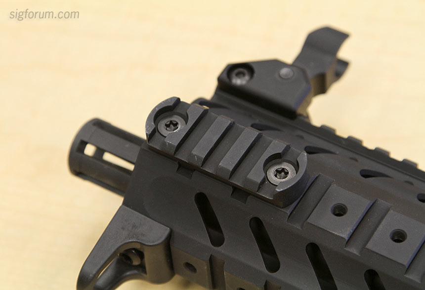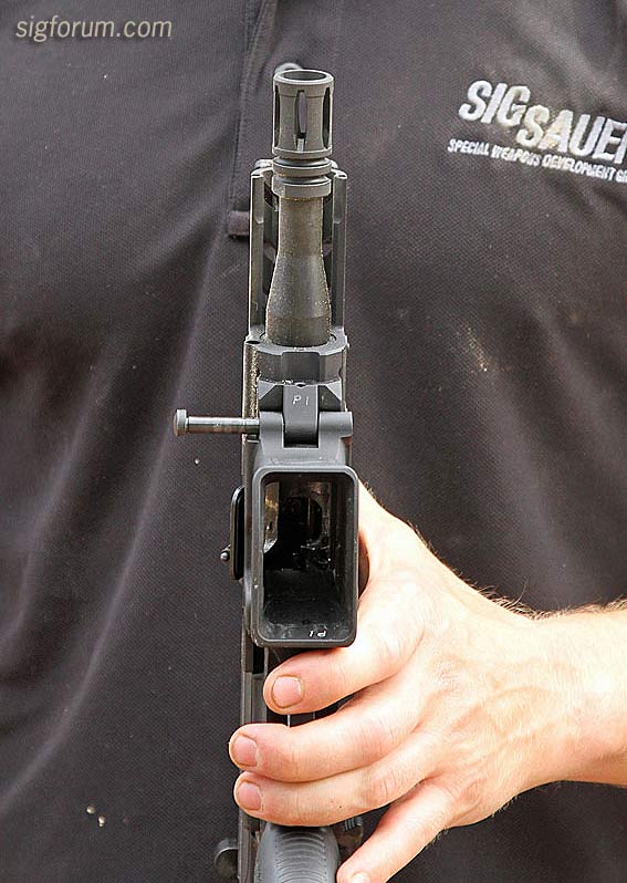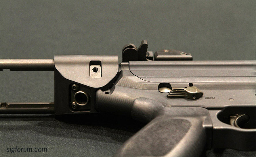 另外,为了更方便地转换不同的型号,MPX系列的枪管连接方式也与SIG516/716不同,其枪管节套与枪管为一体,只在枪管尾端与机匣前端通过一个圆柱面配合,再从侧面插入连接销拧紧固定。而因为SIG MPX的浮置式枪管不与护木发生接触,所以护木是上机匣整体向前延伸的一部分。