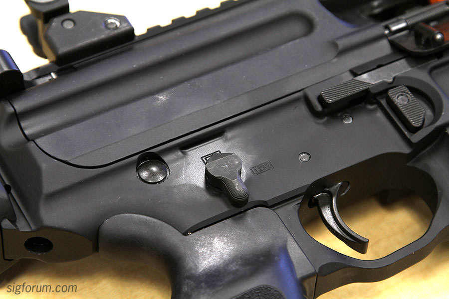 MPX的拉机柄、弹匣卡笋、空枪挂机解脱钮、以及左右两面都有的快慢机柄等操控装置也与AR式步枪基本一致,完全就是SIG516/716的“紧凑版”。不过也有稍为不同的设计,例如MPX的“T”型拉机柄两侧都有定位钩,当然这个也不是SIG首创,在商业配件市场上一直都有两侧定位钩的AR式拉机柄出售,只不过在SIG516/716上标配的仍然是单侧定位钩的拉机柄。另外,在MPX的抛壳口上也和AR式一样有一个能自动打开的防尘盖,而且设计上也是AR式的缩短版。