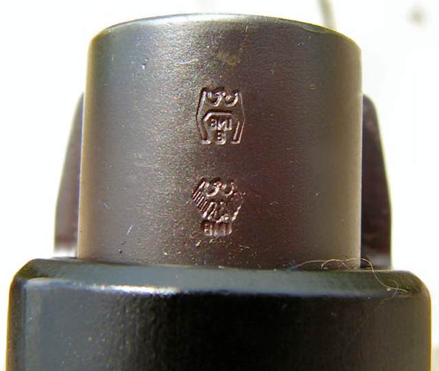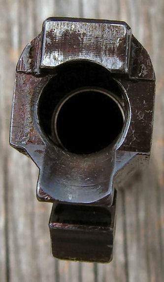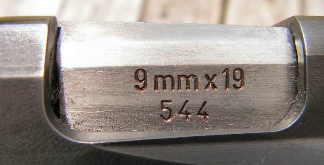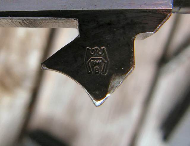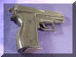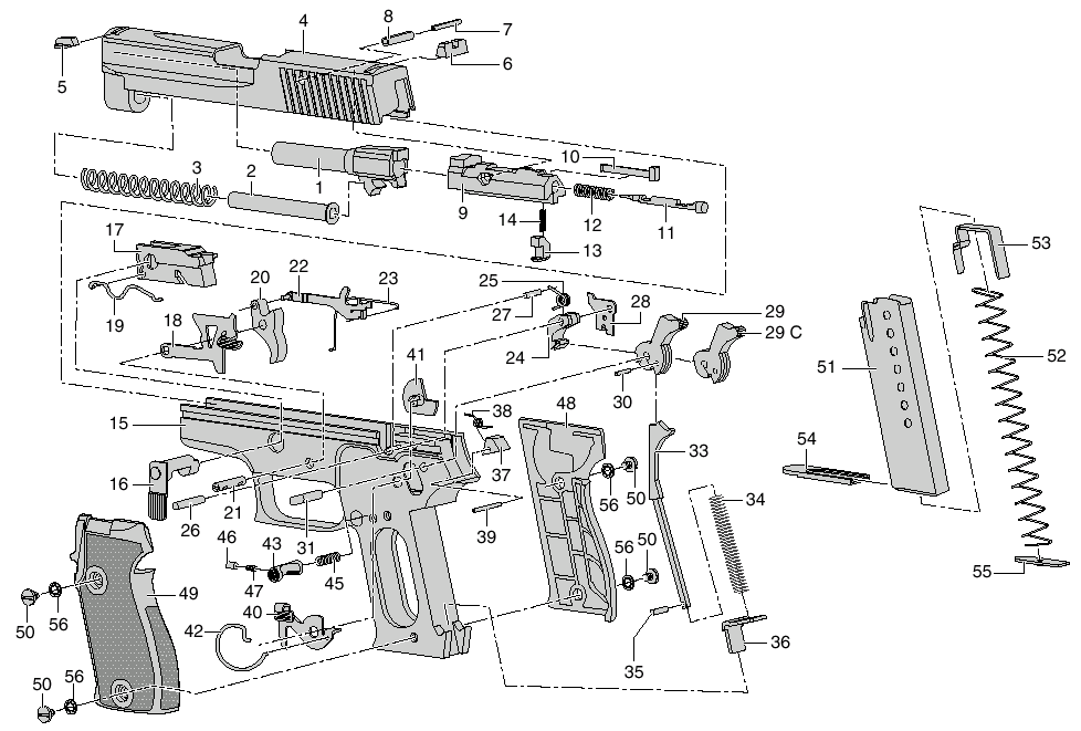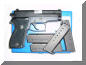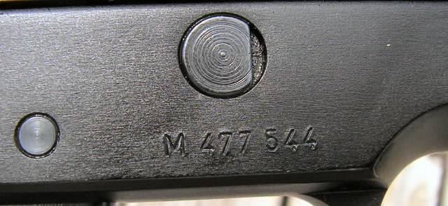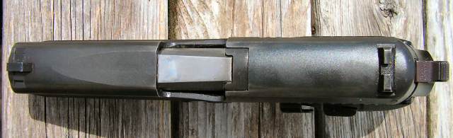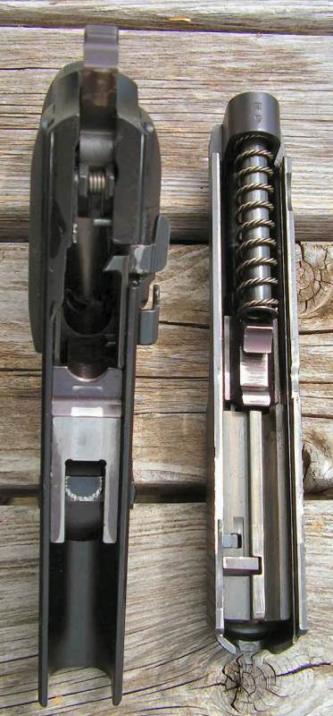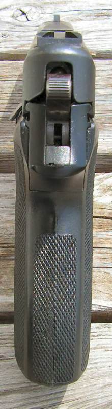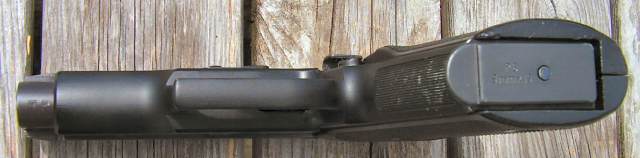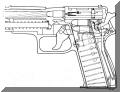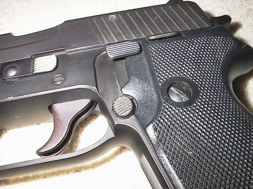 P225的控制机构:图左侧板机上方的是长方形的分解旋柄;板机后方的是圆形的弹匣释放扣;弹匣释放扣的上面是待击解脱杆,待击解脱杆的后面是空仓挂机柄。