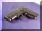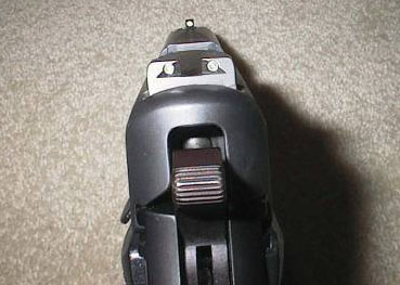 更换了氚光源夜光瞄准具的P225,出厂时的标准瞄准具只是普通的哑黑色瞄准具。