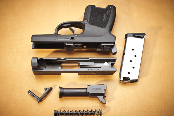 P290的套筒特征还是沿用P220系列的设计风格,但采用全工程塑料的底把及纯双动扳机,因此没有手动保险,外露击锤也是塑料制成的。采用与P22x系列相同的勃朗宁闭锁系统,套筒是不锈钢。枪很短,也很轻。握把侧片可以更换,有塑料型和木制型供选择,因为要方便隐蔽携带,该枪没有像时下流行的设计一样配附件导轨,而是像以前的SIG Pro一样提供了一个保形激光指示器。弹匣为单排,有两种容量,一种6发,一种8发加长型。机械瞄具是SIGLITE三点式,内有氚气发光管。