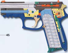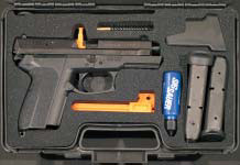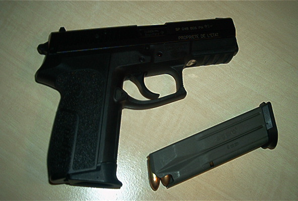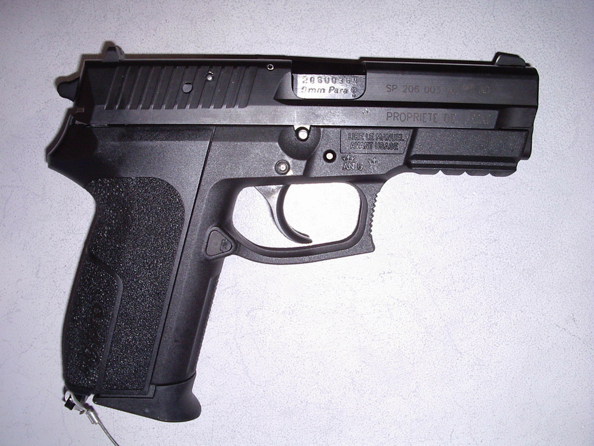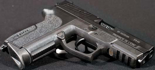 SP2022还有一个有趣的地方,就是在底把上植入了一块感应芯片,把手枪的序号和所用警察的姓名、单位、性别和惯用手(左手或右右)等资料都记录起来。 每把SP2009或SP2340通常只配一本说明书、两个弹匣和一个测试靶,用一个厚纸板盒包装,但是每把SP2022则配有两个弹匣、一个弹匣快速装填器、一套通条和枪刷、一瓶枪油、一个后膛式枪锁,还有一个训练用的塑料假枪管,都放在一个漂亮的塑料盒内,这些是应法国政府的要求而做的。 |