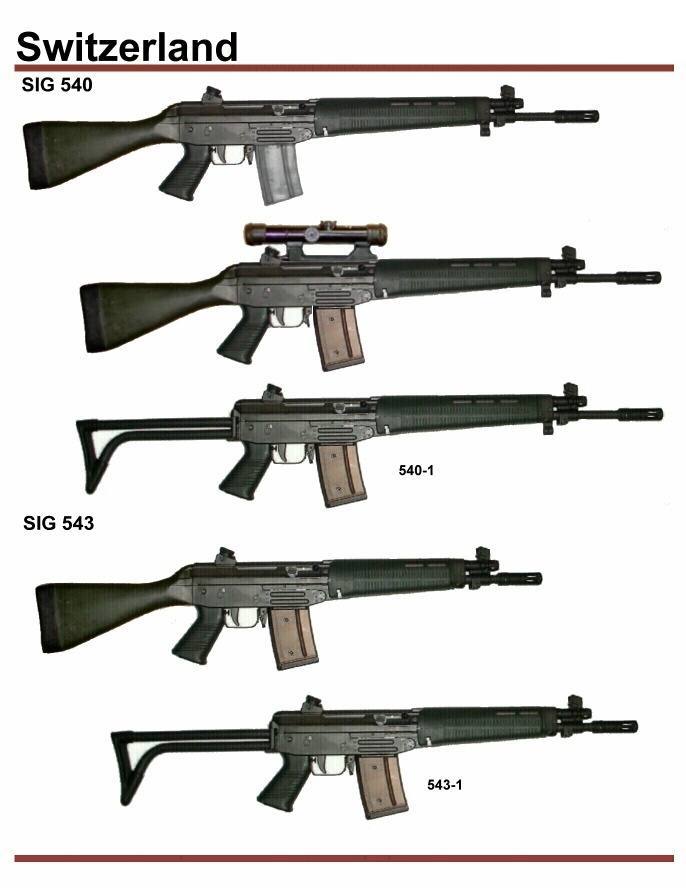 除了SG540和SG542外,SIG公司还在1975年研制了短枪管的卡宾型SG543。另外,SG540系列中还有半自动的民用型,而且是.222雷明顿口径,另外还有7.62×39mm俄制口径和.243温彻斯特口径,不过这两种都是极其稀有的产品。