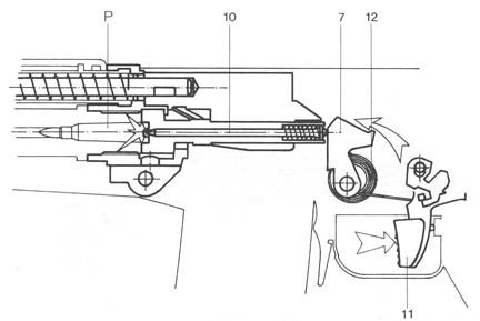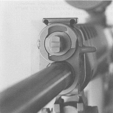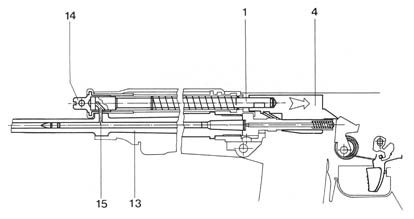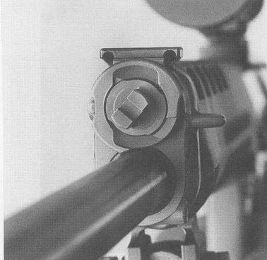 | 弹头经过导气孔后,火药气体进入导气室,推动活塞进行自由后坐,活塞杆推动机框开始后坐 |