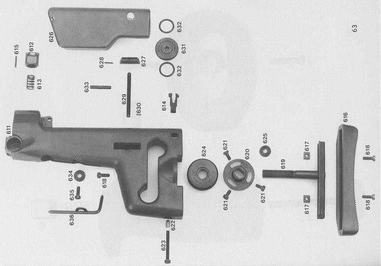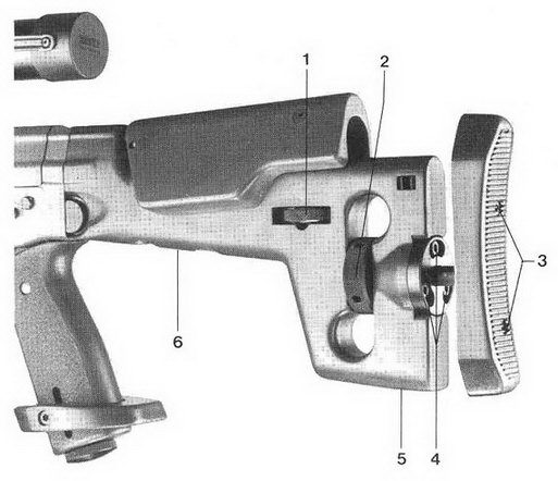 枪托上的可调部件:1为调节贴腮板高低,2为调节托底板长度,3为调节托底板高低,4为固定托底板安装环的内六角螺杆,5为固定托底板左右旋转角度的内六角螺杆,6是一条带磁力的槽,收藏了一个内六角扳手。