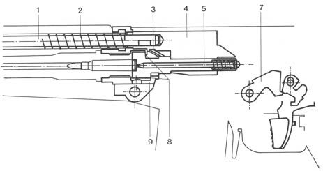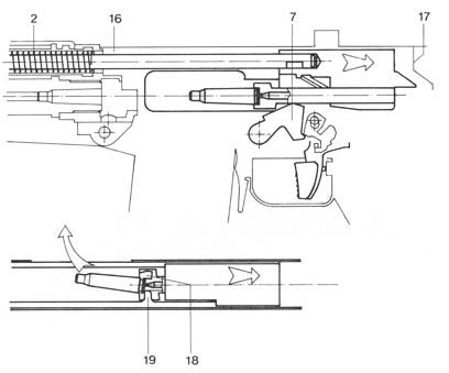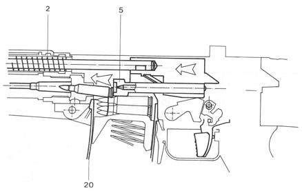 | 枪机开锁后,枪机组开始在膛内气体压力下后坐,同时抽出弹壳并抛出 |