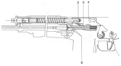 | 击锤打击击针,击针撞击底火 |