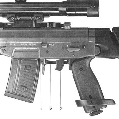 在击发机座两侧都有手动保险柄,因此无论右撇子还是左撇子射手都能方便操作。但由于只需要单发射击,因此虽然SG550狙击步枪的保险柄和突击步枪的快慢机柄外形相同,但只有保险和射击两档。和突击步枪一样,SG550狙击步枪的扳机护圈也可以向左或向右掰开,以便射手戴上厚厚的防寒手套后也能扣扳机。