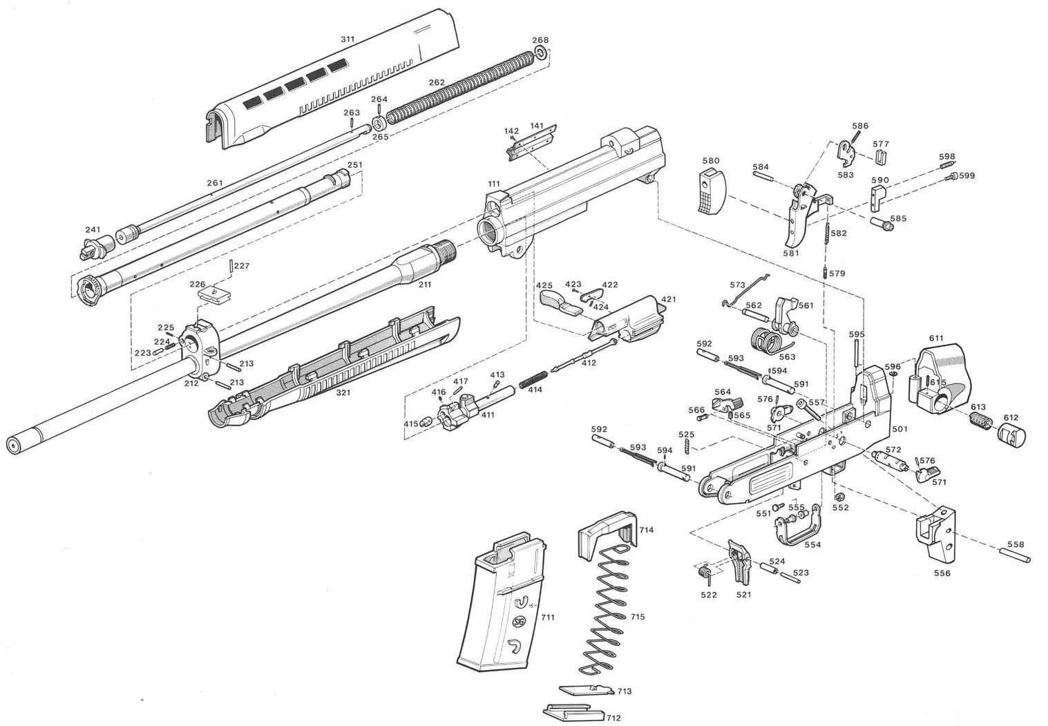 SG550突击步枪原本就在下护木安装有一个两脚架,并且可以收容在下护木底部的两道凹槽内。虽然SG550狙击步枪的下护木仍然维持原来的设计,不过简单的两脚架改为派克-哈尔的可调式两脚架,如前所述,它可以调节高度和倾斜角度,又能平稳地左右转向,每根腿架底部都有一个可旋转的橡胶垫。不过由于这个两脚架的尺寸和外形偏大,所以下护木的脚架收容槽对于狙击型来说是多余的,SIG估计只是出于节省成本的做法而直接使用突击步枪的下护木。