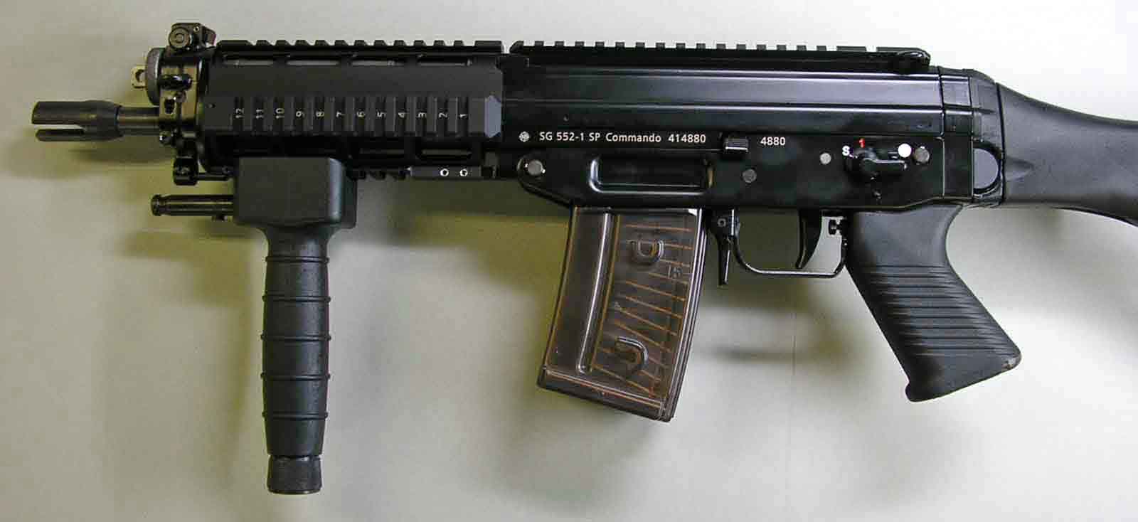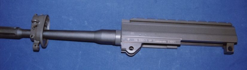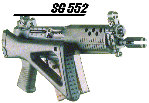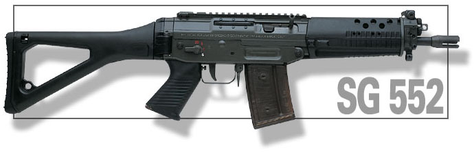 SG552 Commando(突击队员型)在1998年推出,是SG55x系列中最短的型号,这是一种受潮流影响而设计的CQB用短突击步枪,比起SG551系列,SG552的枪管进一步缩短至8.9英寸,并把质心后移以方便控制提高射击精度。扳机护圈可向左右两侧折叠,带手套也可操作。另外SG552的复进簧位置与SG550和SG551并不相同,并非绕在枪管上方的活塞杆中,而是移至枪机后方。