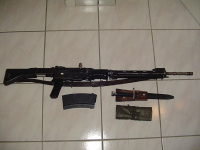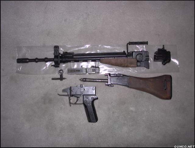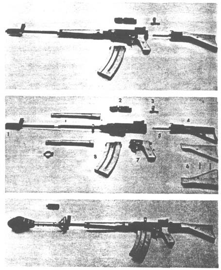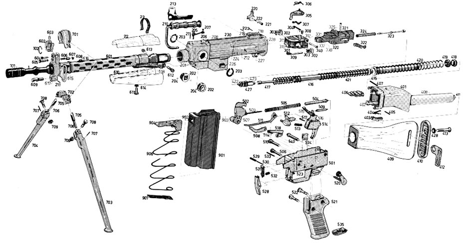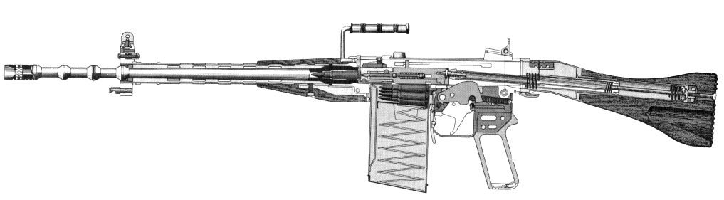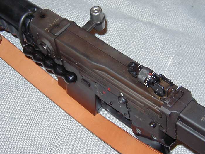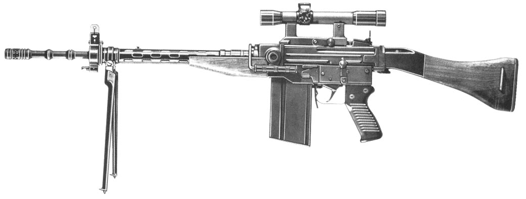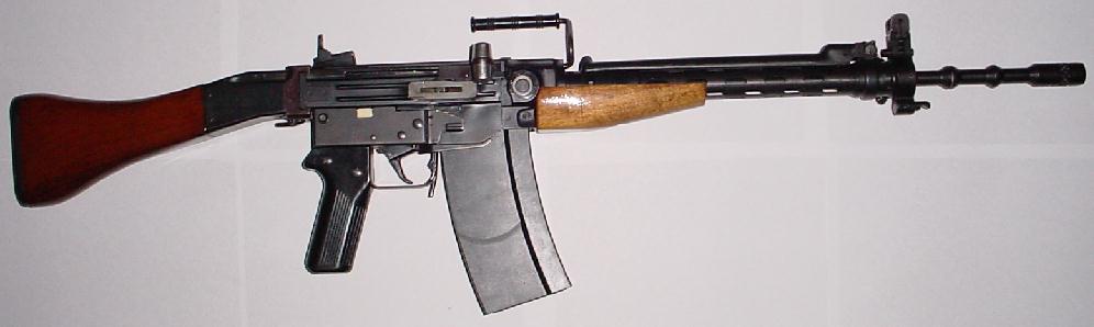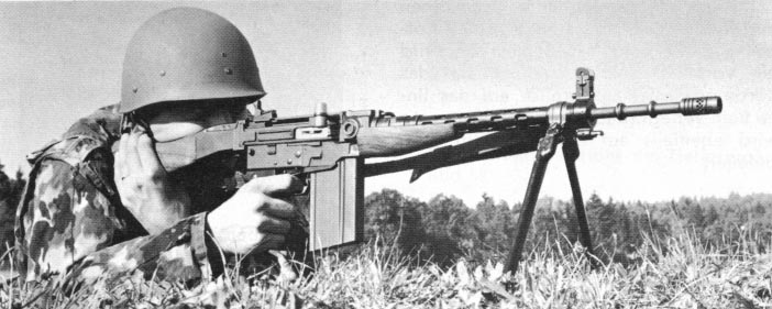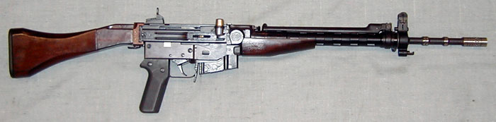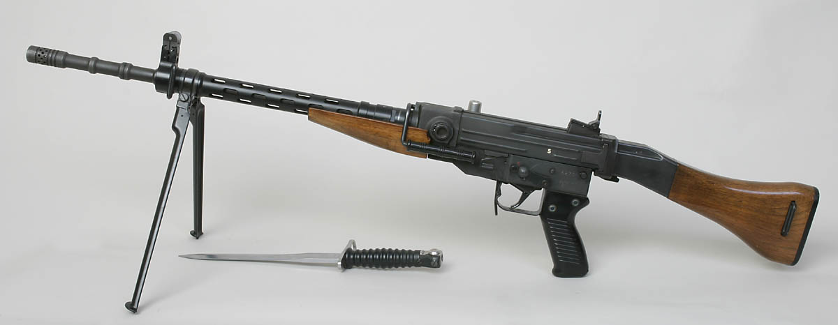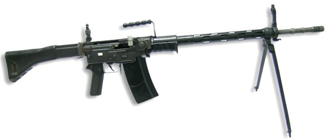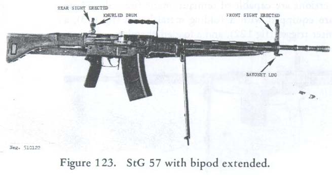 该枪采用冷煅枪管。如同其它采用枪机后座原理的武器一样,为便于抽壳,弹膛内壁有16条纵槽,从弹膛口部向后延伸30mm。枪管上装有发射枪榴弹用的密封环,枪口有消焰制退器。枪管后部套有带孔的护筒,两脚架装在准星后面,可以折叠。必要时,可折拢架腿,转动两脚架,将其置于枪管上方。刺刀装于准星环座下面的刺刀座上。