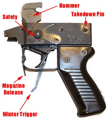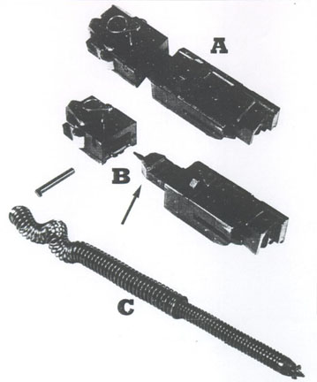快慢机装定于“自动”位置时,扳机后端的凸肩可抬得相当高。这样,当阻铁头与击锤缺口解脱时,由于扳机凸肩上抬的幅度大,阻铁头便降得很低。于是,击锤被压倒后,它就不会与阻铁接触,而只受不到位保险阻铁的控制。在枪机确实闭锁之前,击锤一直被不到位保险阻铁挂在后方。等到机体复进终了时,保险阻铁即被压下,解脱击锤。由此可见,该枪全自动射击的击发动作是由枪机闭锁位置控制的,由此还起到击发前的机械保险作用。一旦松开扳机,阻铁头便上抬,将被枪机后座所压倒的击锤挂住,使击锤停留于后方。