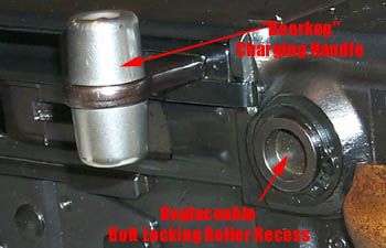 SIG枪机延迟后座的滚柱闭锁凸轮槽机构中最新颖之处是它采用了两个可以更换的闭锁槽,而且每个闭锁槽又靠碰珠和开口环牢固定位。该机构的另一特点是没有使用HK G3那种靠强力弹簧带动的机头卡扣。由于滚柱直径大,表面光洁度高,机匣闭锁槽的接触面又小,这都减小了枪机在取弹和推弹入膛时的摩擦力,所以手拉装填比较省力,机柄亦可做得简单一些。