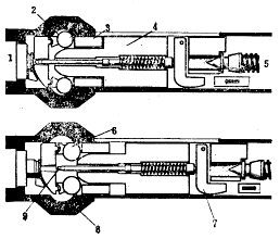枪机开闭锁动作示意图:1-枪管;2-滚柱座;3-机头;4-机体;5-复进簧及复进簧导杆;6-滚柱;7-击发杆;8-机匣;9-击针。