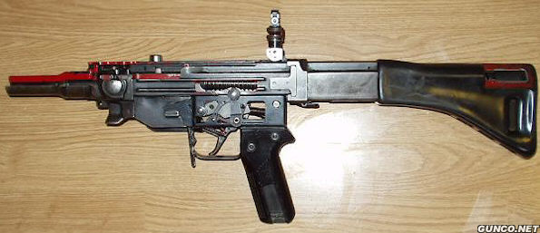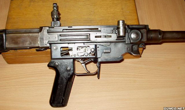 滚柱离开闭锁槽后,后效期压力推动整个枪机后座。由于机体的楔形前端有19°的角度,所以机体加速后座,机体和机头之间便产生相对位移。分离后的机头和机体一起后座,将第一复进簧压入枪托之中。