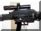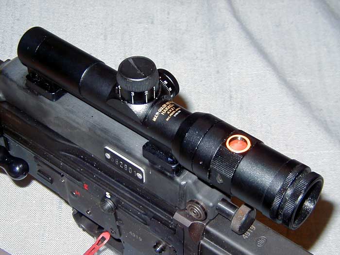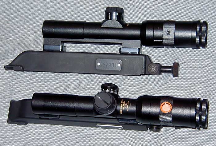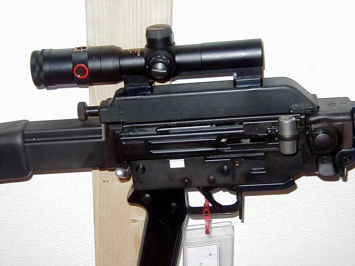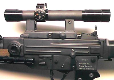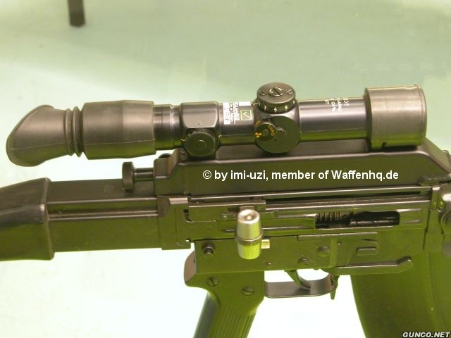 该枪可配用Kern 4x24瞄准镜,该瞄准镜重730克,通过夹座固定于机匣上,放大倍率为4,射程调节从100米至600米,夜间使用时可照亮分划。另外还可装红外瞄具或图象增强瞄具。
