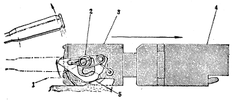 抛壳动作示意图:1-击发前的抛壳挺位置;2-抛壳挺和抛壳挺回复簧;3-机头;4-机体;5-机匣上的抛壳斜面